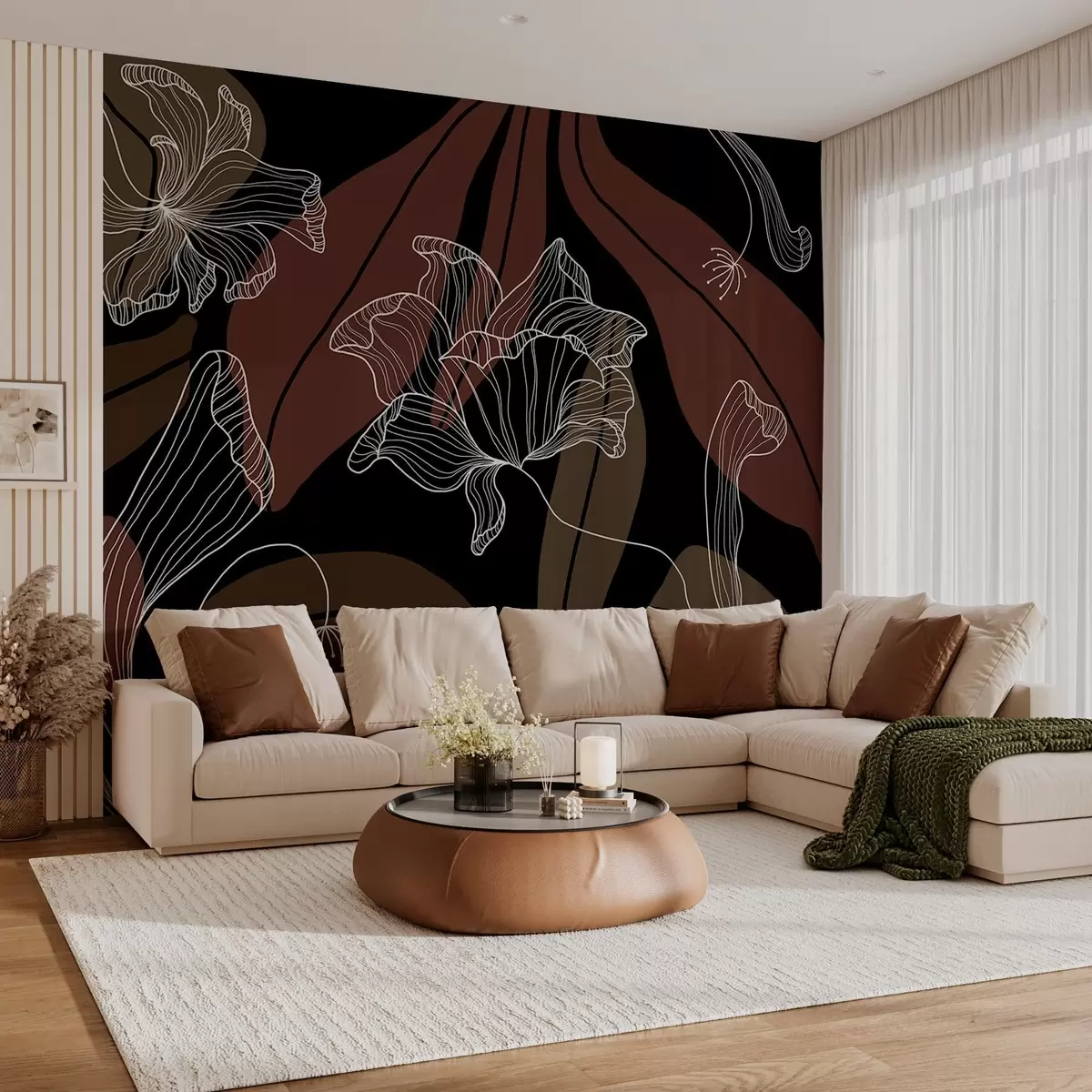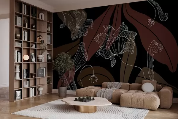 Fototapeta abstrakcyjne liście i kwiaty w pudrowych i beżowych odcieniach na ciemnym tle Nr w04499v3