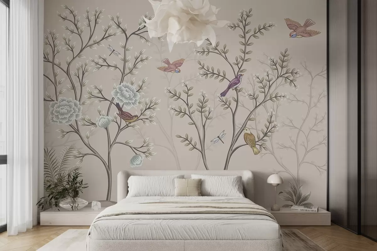 Fototapeta Drzewa z ptakami i kwiatami Nr w04605