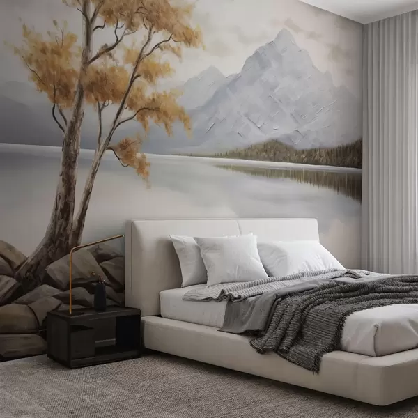 Fototapeta Jesienne drzewo nad górskim jeziorem, spokojne pastelowe kolory Nr w04611