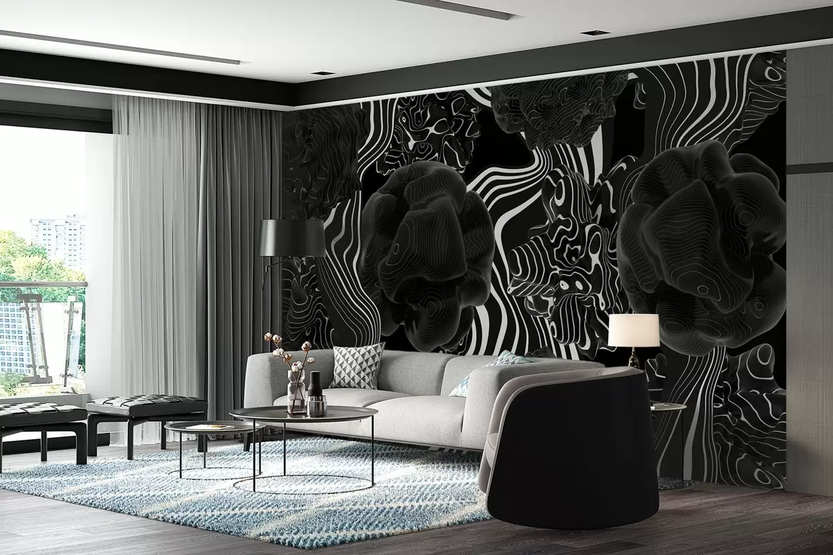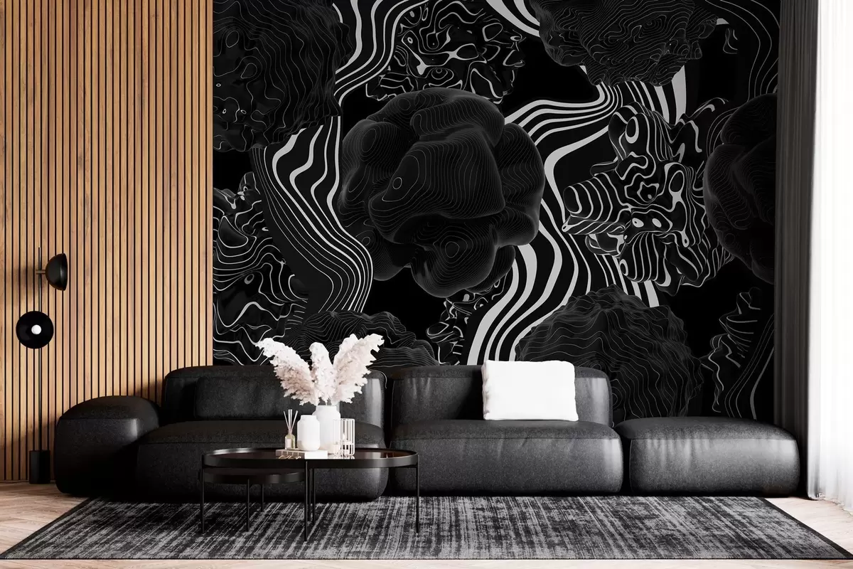 Fototapeta abstrakcyjne organiczne kształty w stylu 3D w odcieniach czerni z białymi paskami Nr w04628
