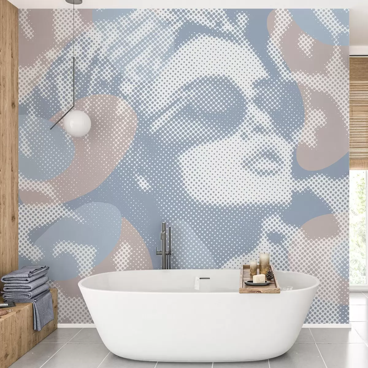 Fototapeta portret kobiety na tle lamparta w stylu kropkowanym w odcieniach niebieskiego Nr w04630v1