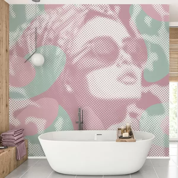Fototapeta portret kobiety na tle lamparta w stylu kropkowanym w odcieniach różu i zieleni Nr w04630v2