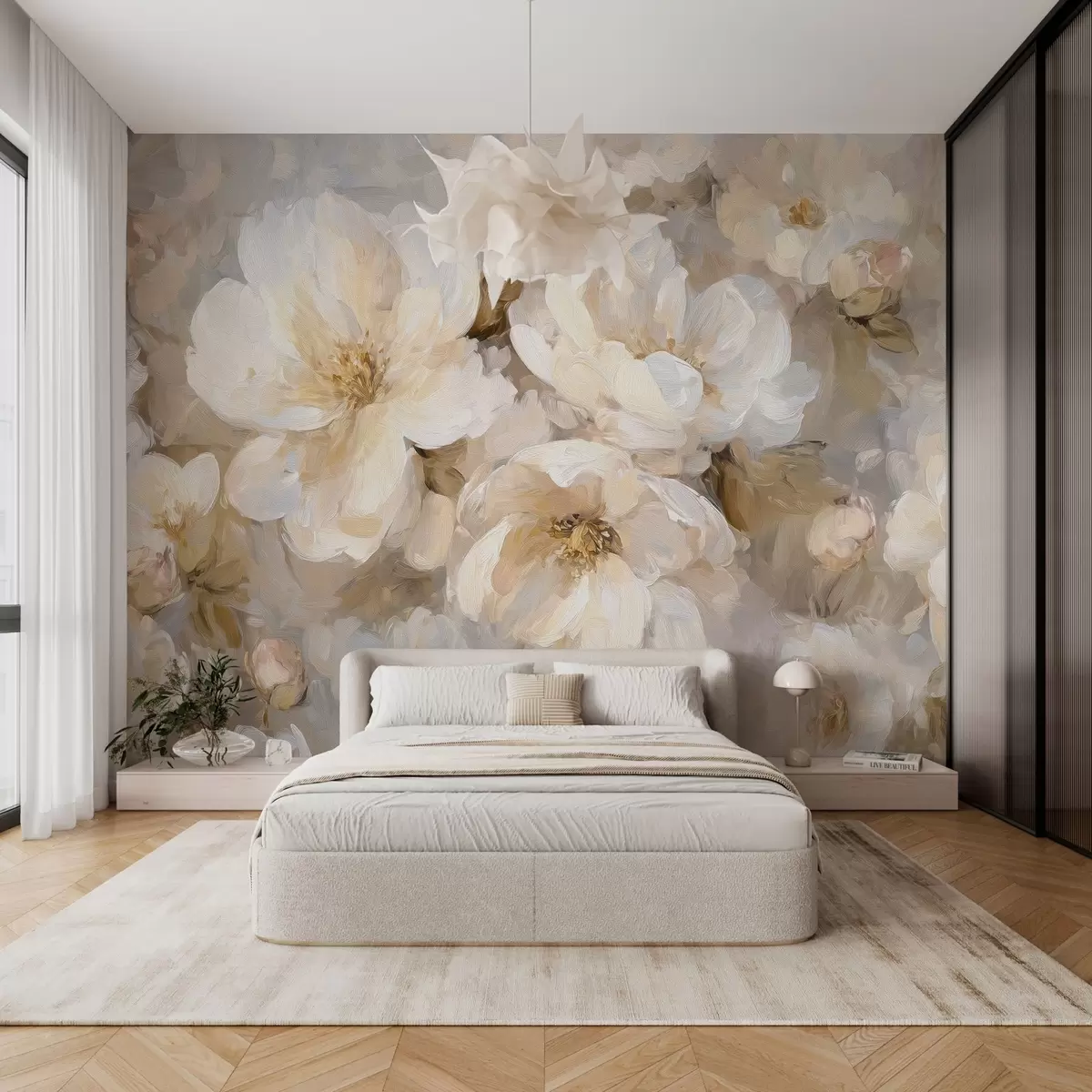 Fototapeta duże kwiaty w odcieniach bieli i beżu w stylu malarstwa olejnego Nr w04633