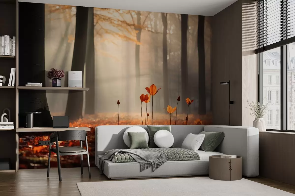 Fototapeta Jesienny las w promieniach słońca i wśród jasnych liści Nr w04710