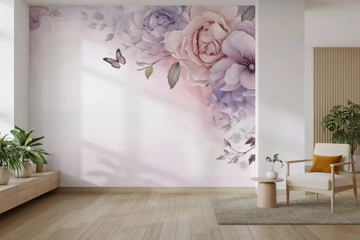 Fototapeta Delikatne różowe i liliowe kwiaty z motylem Nr w04711