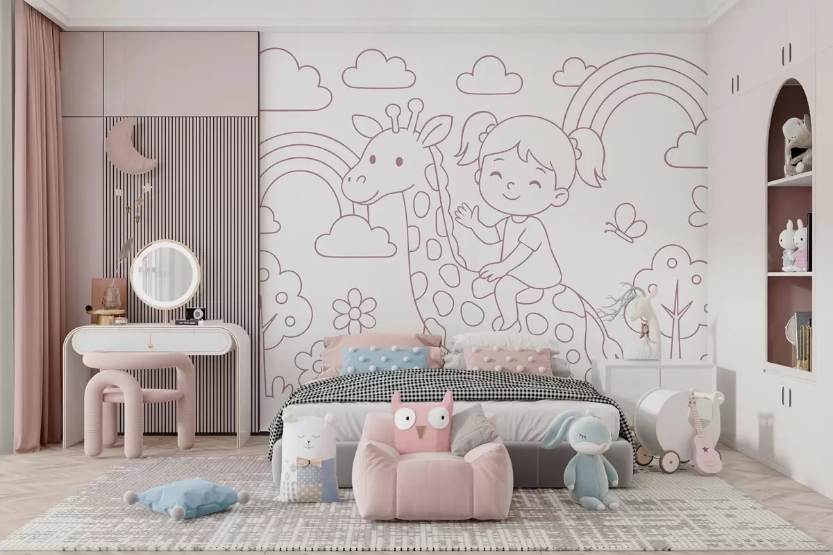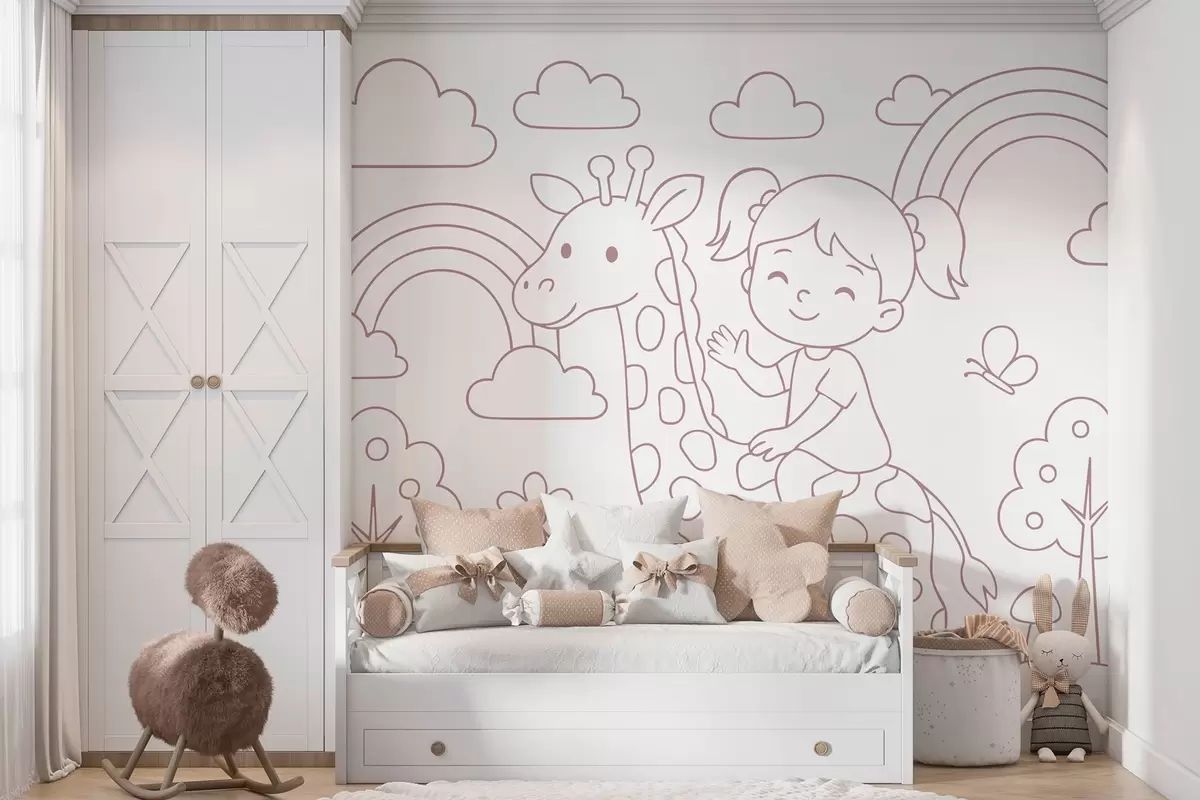 Fototapeta malarstwo proszkowe przedstawiające dziewczynkę na żyrafie w stylu kolorowanki dla dzieci Nr w04753v1
