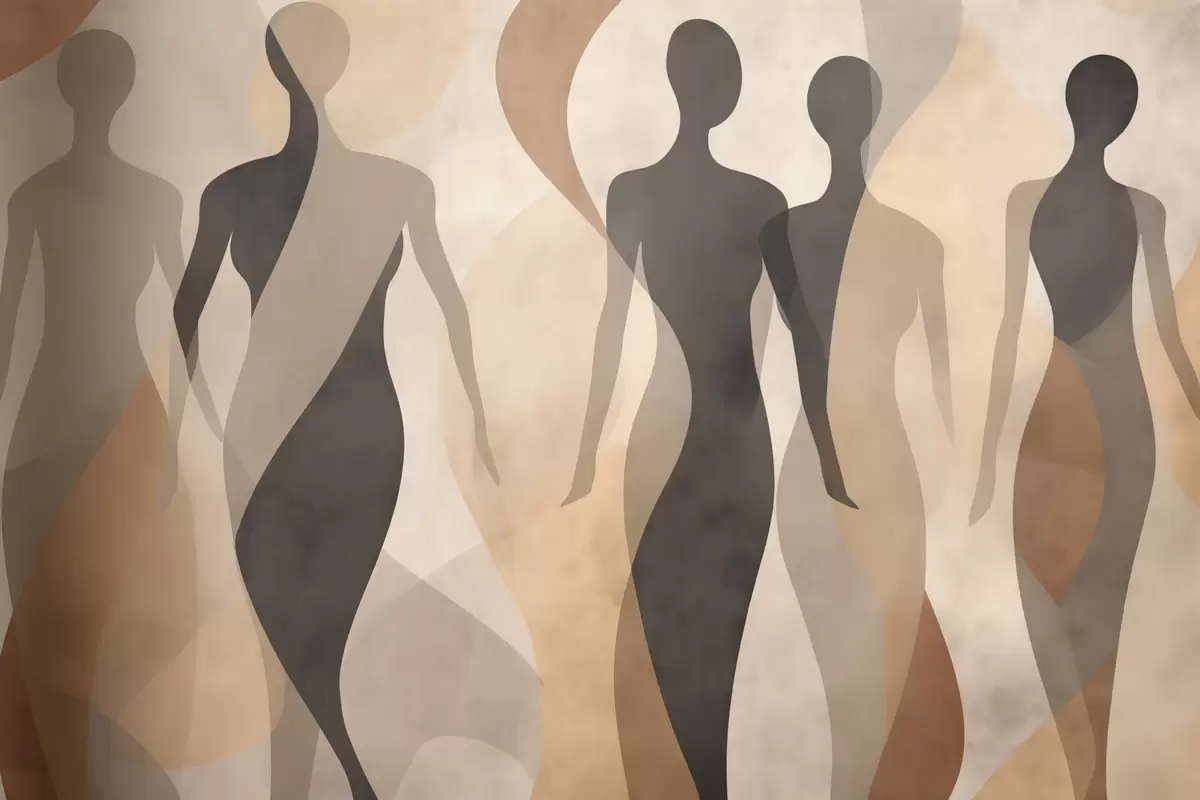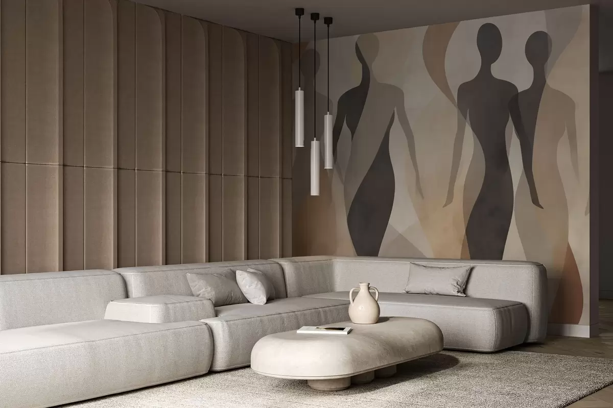 Fototapeta Sylwetki postaci i delikatne fale w ciepłych odcieniach beżowo-szarych Nr w04787