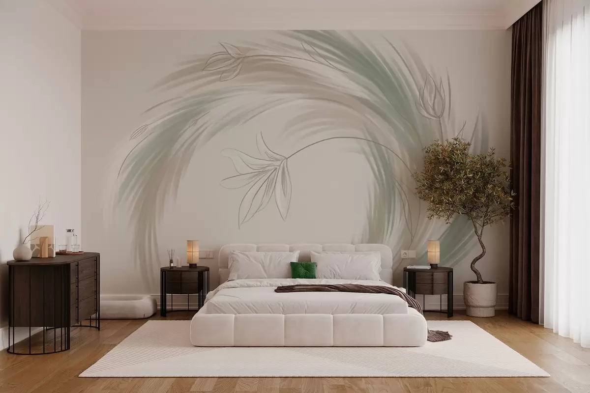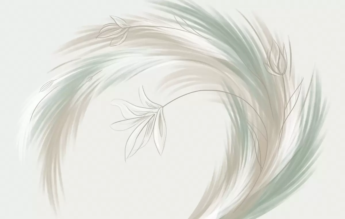 Fototapeta zielone i beżowe pióra i kwiaty, ręcznie malowane Nr w04816