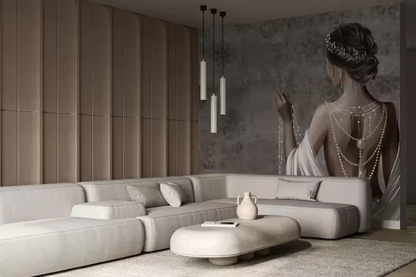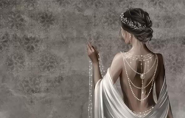 Fototapeta Kobieta widziana od tyłu z perłami, szare tło z wzorem kamienia Nr w04854