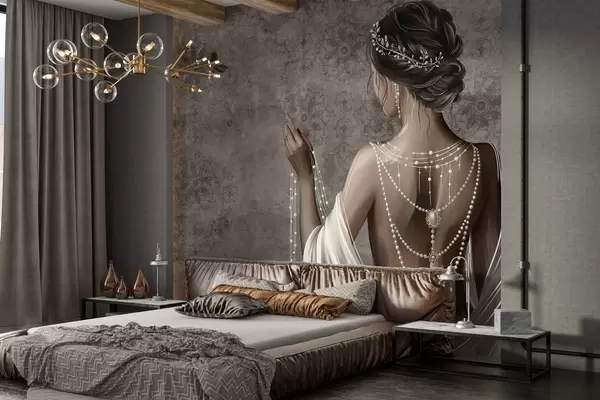 Fototapeta Kobieta widziana od tyłu z perłami, szare tło z wzorem kamienia Nr w04854