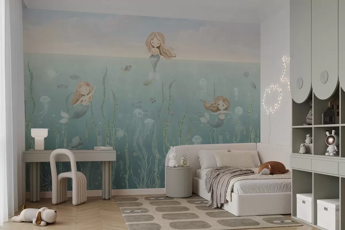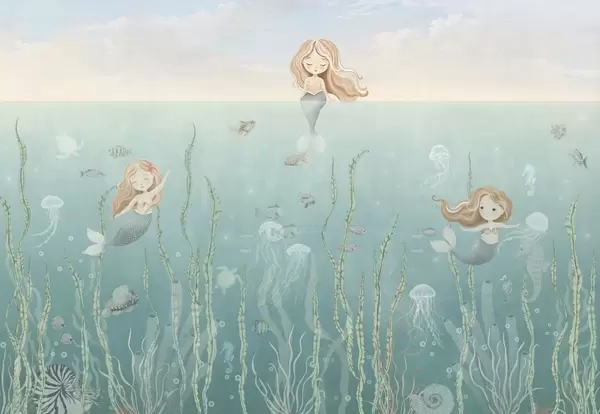 Fototapeta Zabawne syreny pod wodą z wodorostami, meduzami i rybami Nr w04860