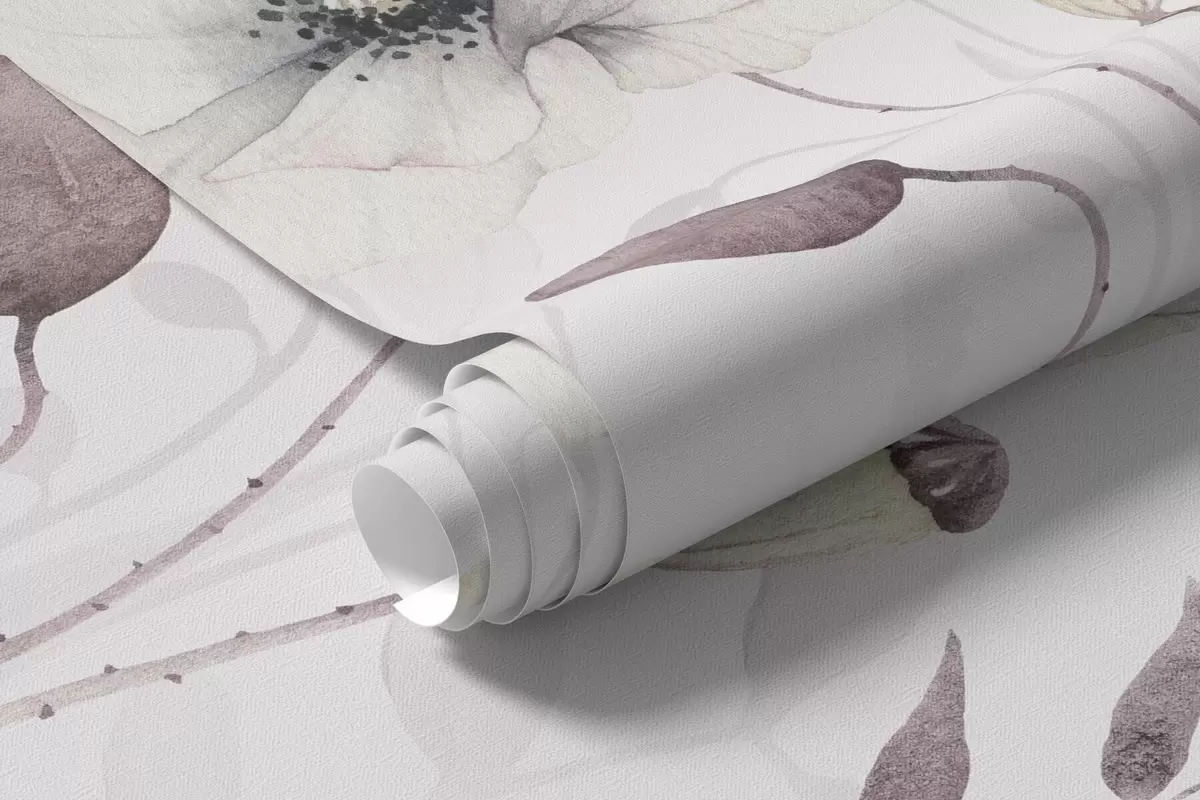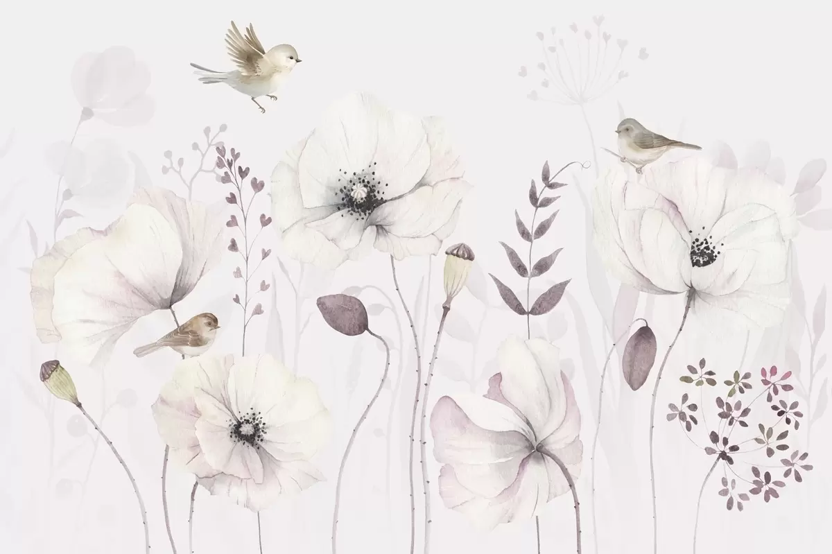 Fototapeta Akwarelowe maki z małymi ptaszkami w delikatnym fioletowo-różowym kolorze Nr w04861
