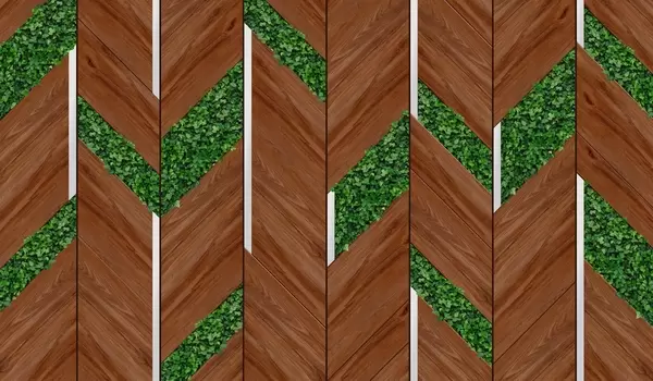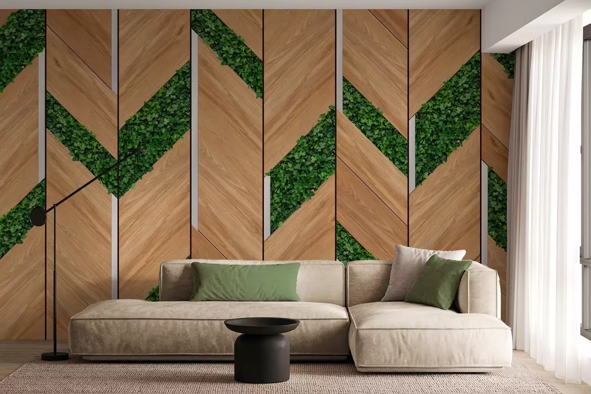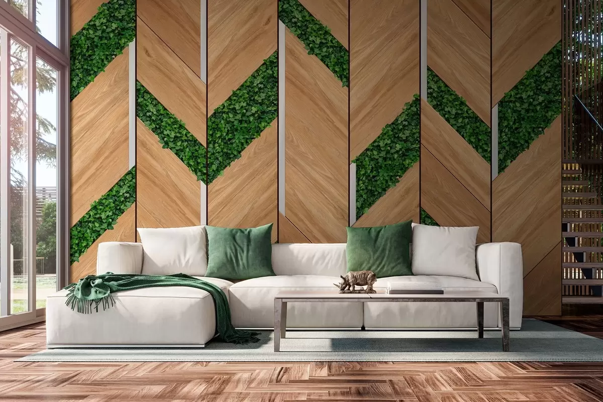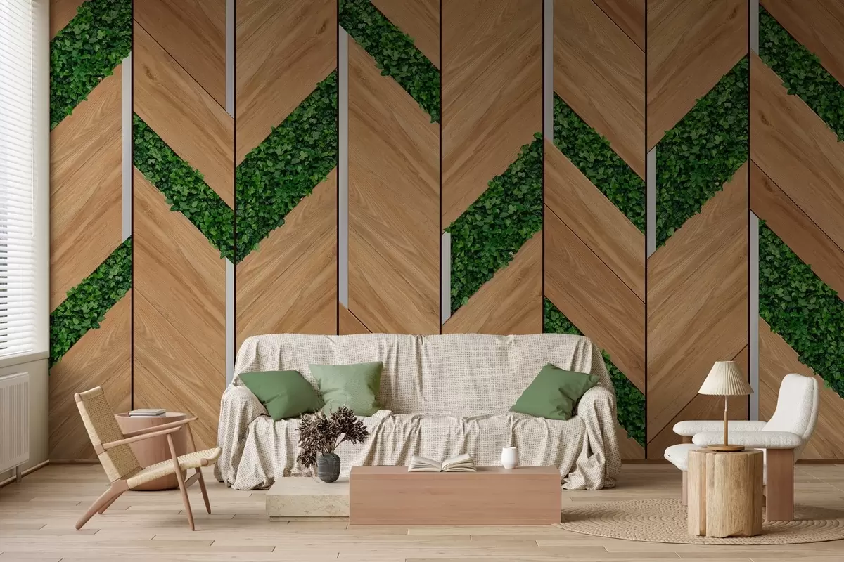 Fototapeta imitacja jasnych paneli drewnianych z wstawkami roślinnymi Nr w04875