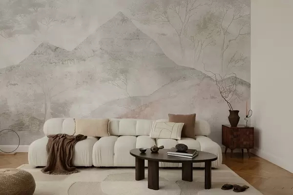 Fototapeta Miękkie pastelowe góry i drzewa w lekkiej mgle Nr w04954