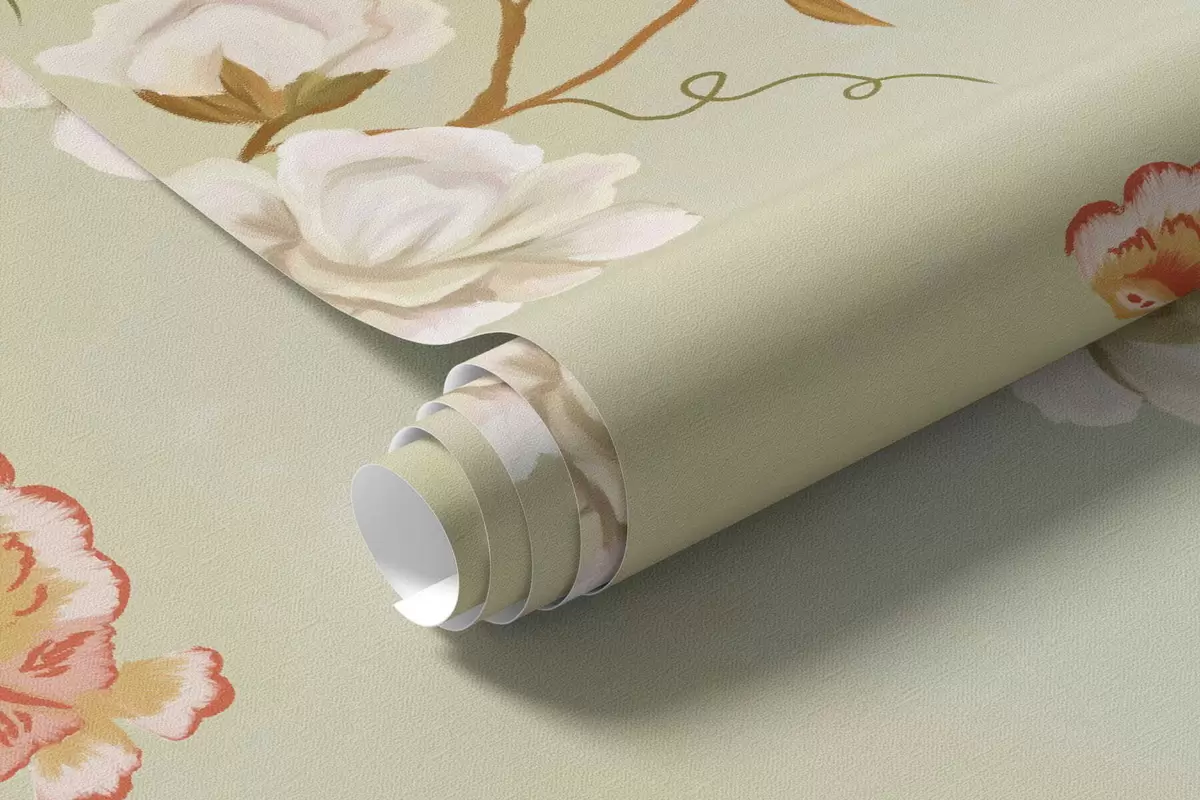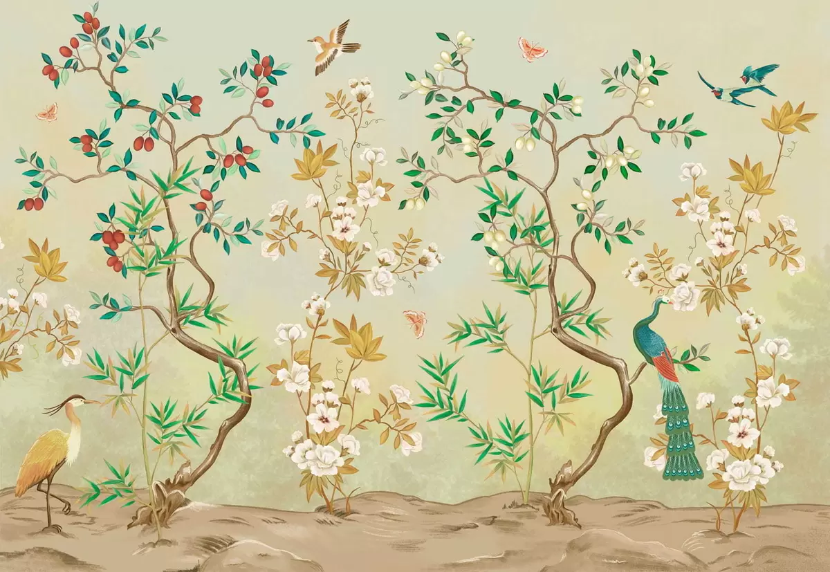 Fototapeta Scena z drzewami, kwiatami i ptakami, jasne tło Nr w05004v1