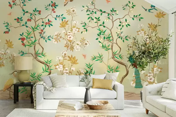 Fototapeta Scena z drzewami, kwiatami i ptakami, jasne tło Nr w05004v1