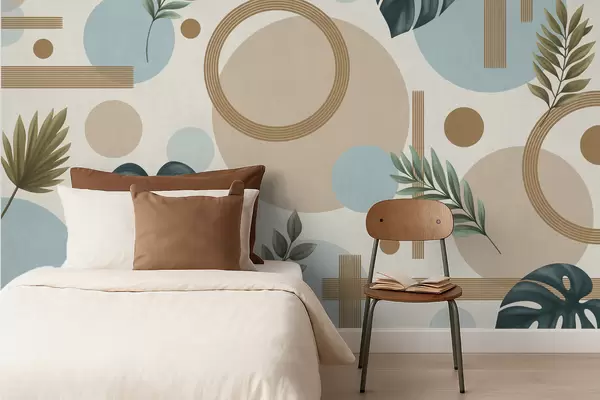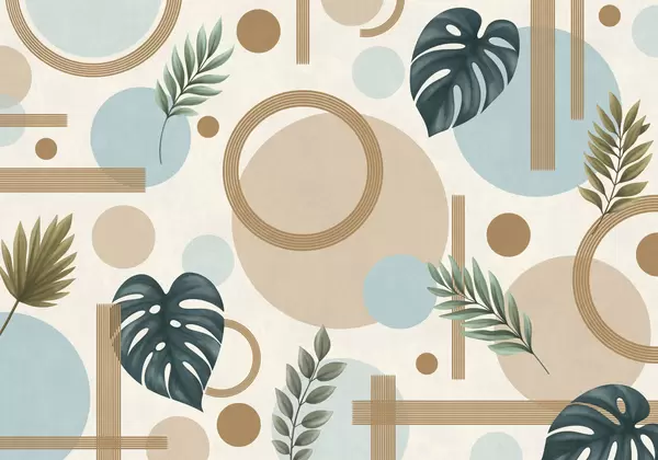 Fototapeta Geometryczny wzór z liśćmi i okręgami w spokojnych odcieniach Nr w05018