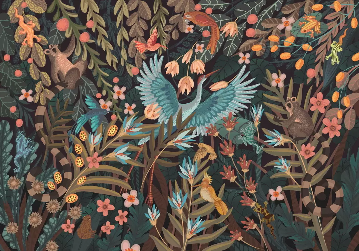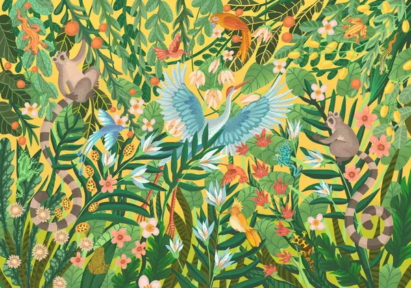 Fototapeta Fantastyczna scena z ptakami i zwierzętami wśród roślin Nr w05024