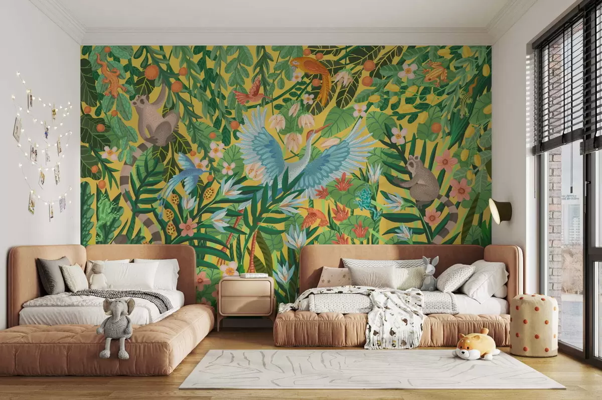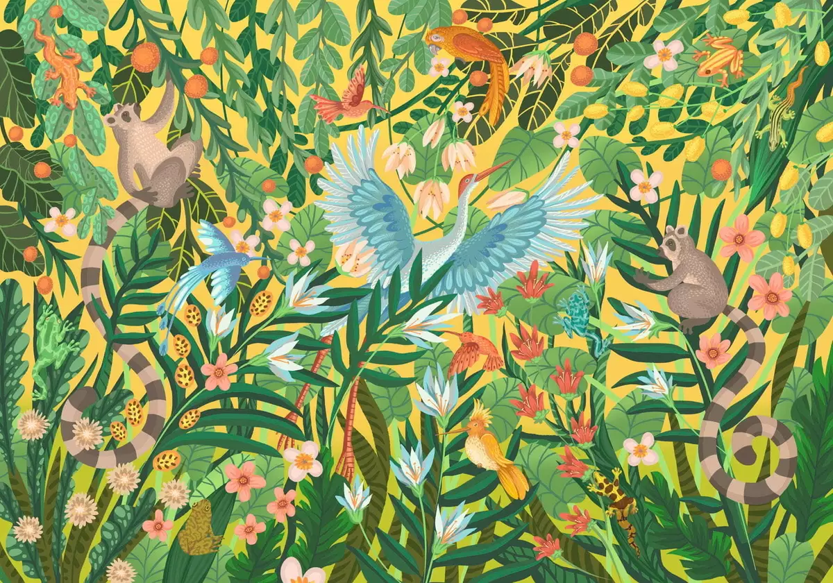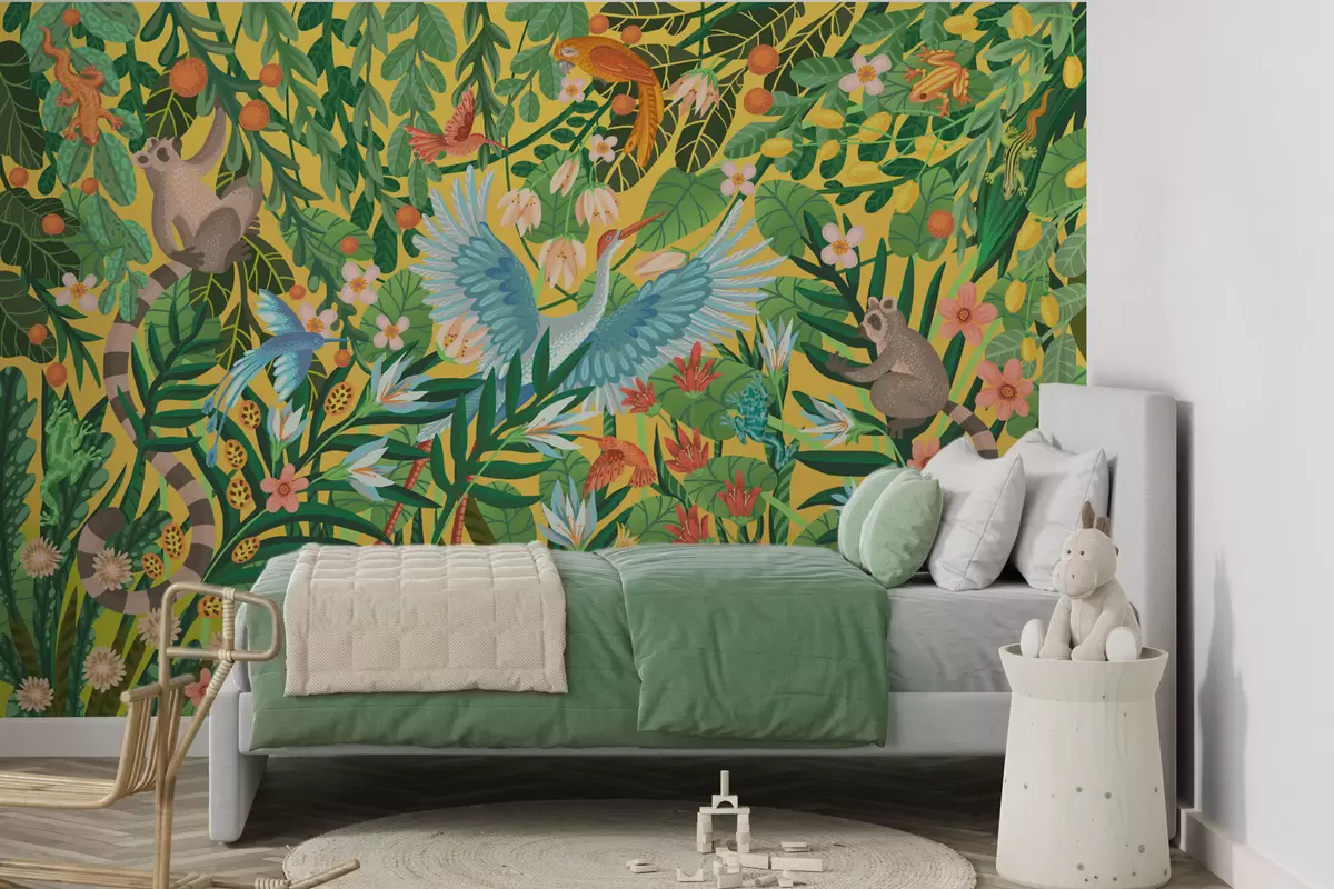 Fototapeta Jasna scena z ptakami i zwierzętami w gęstej zieleni Nr w05024v1