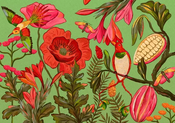 Fototapeta Ozdobne kwiaty i ptaki na niebieskim tle Nr w05036