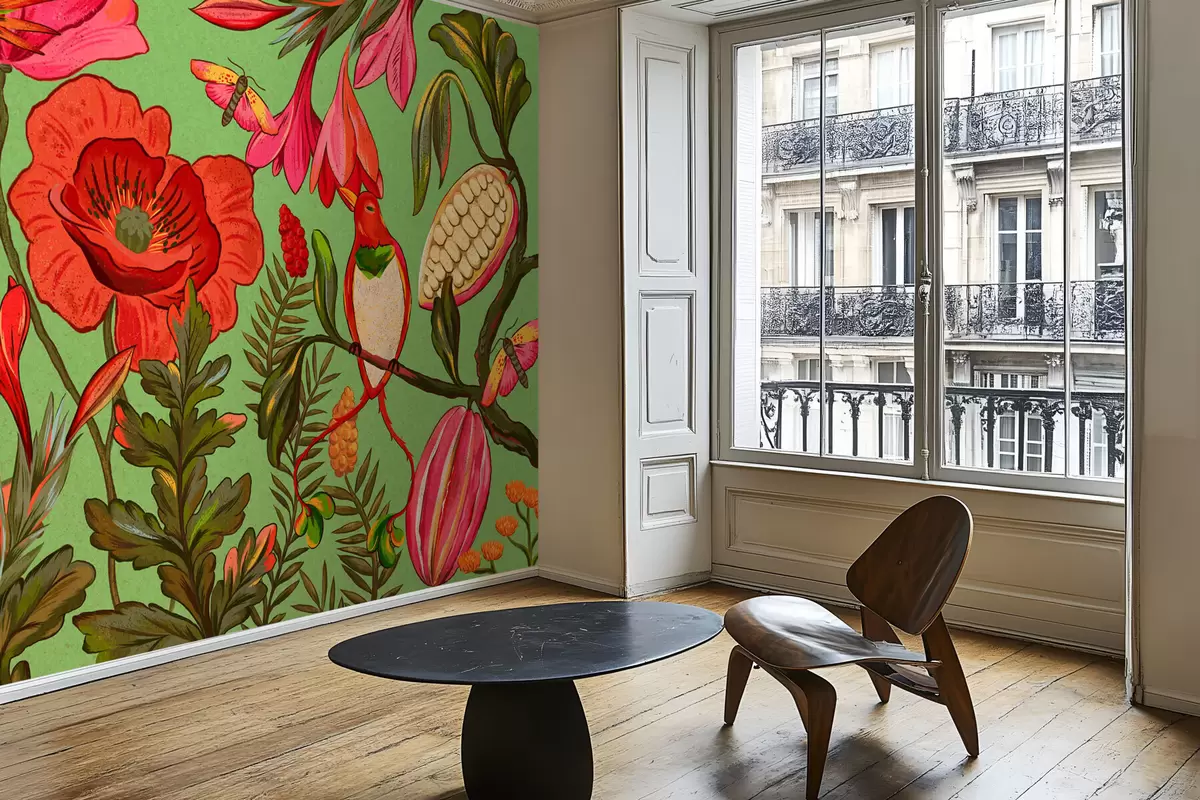 Fototapeta Ozdobne kwiaty i ptaki na zielonym tle Nr w05036v1