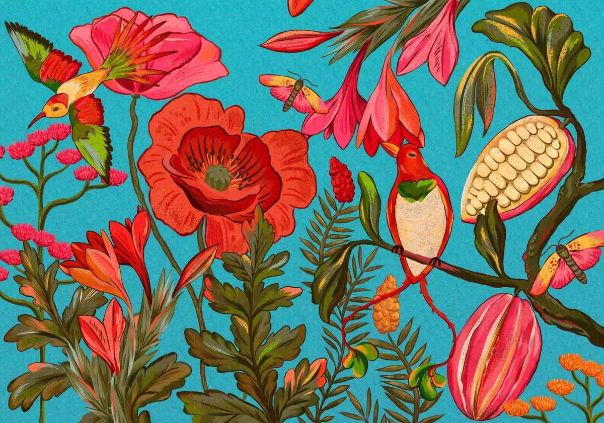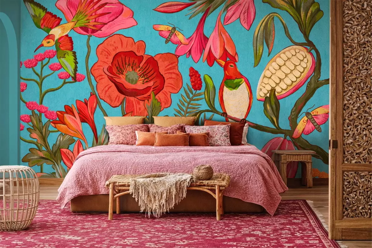 Fototapeta Ozdobne kwiaty i ptaki na niebieskim tle Nr w05036v3