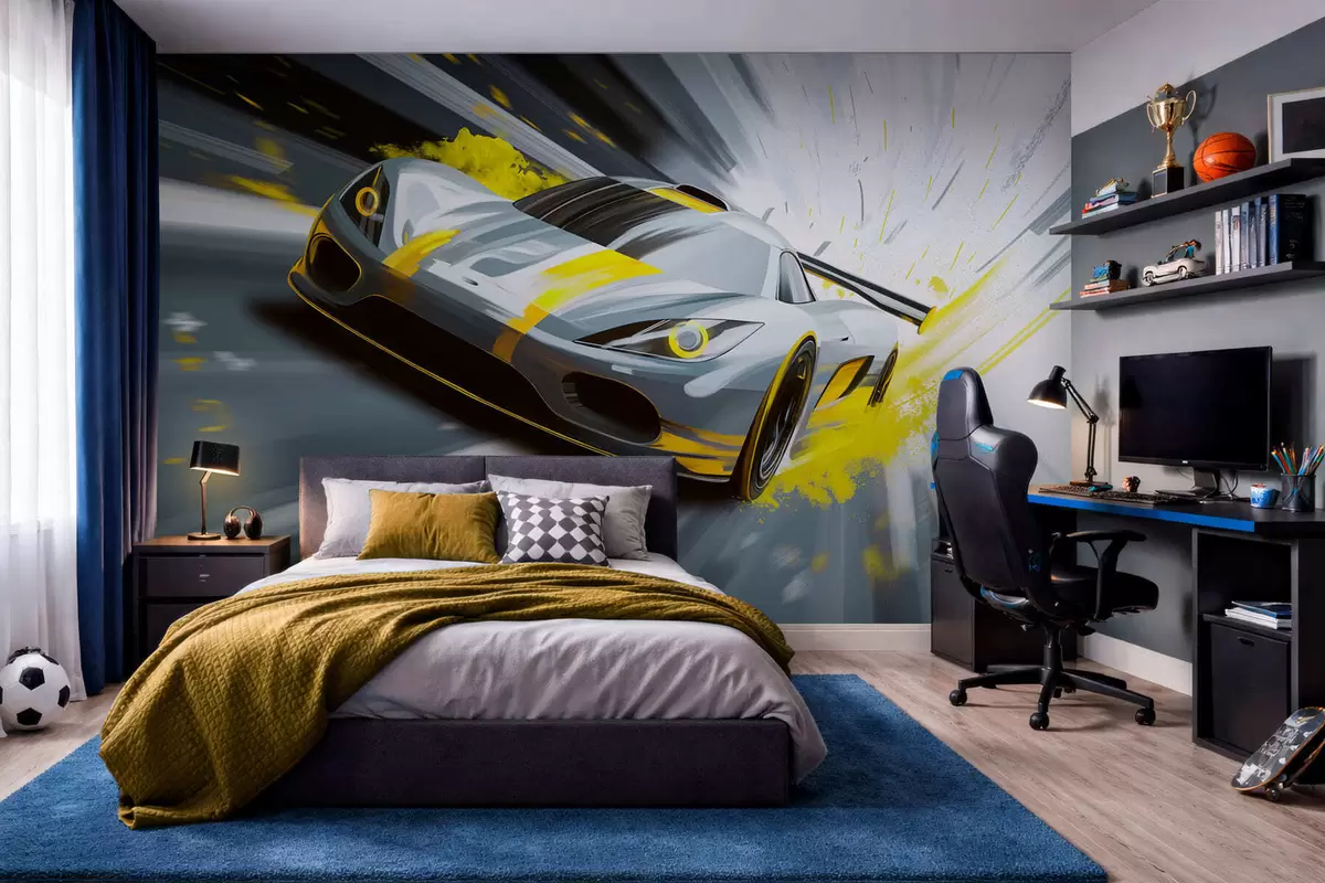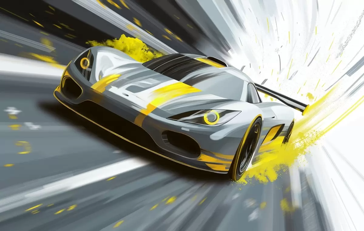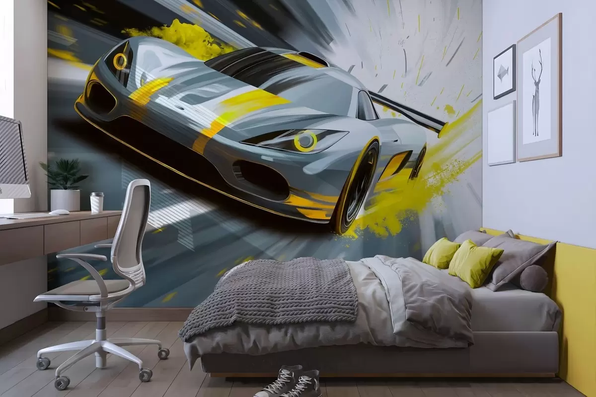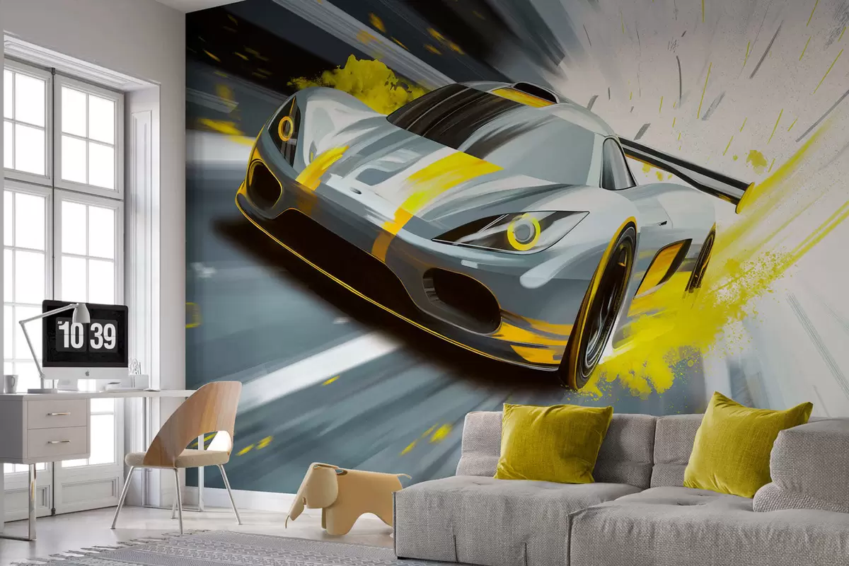 Fototapeta dynamiczny samochód sportowy w stylu rysunku cyfrowego z żółtymi akcentami Nr w05069v2