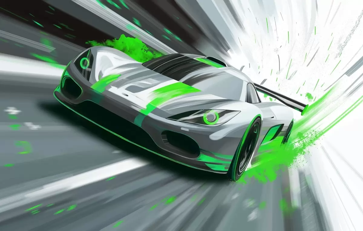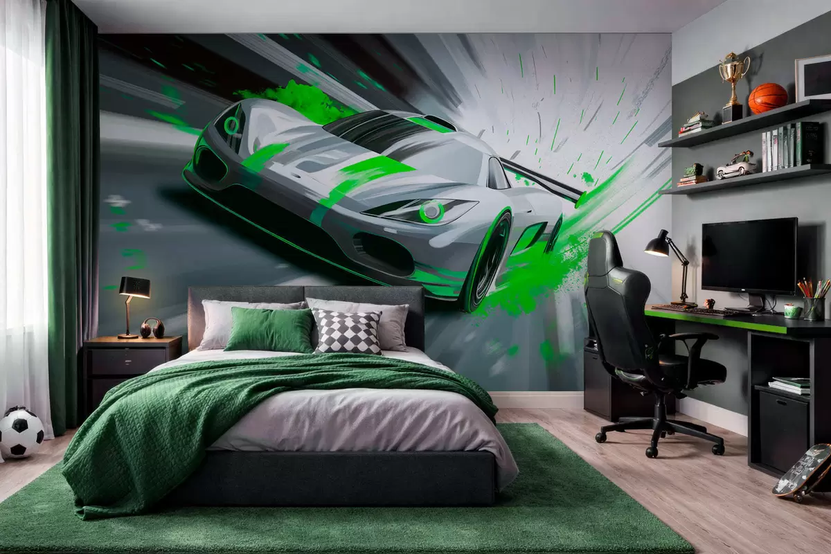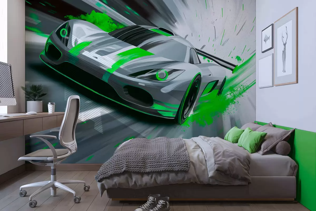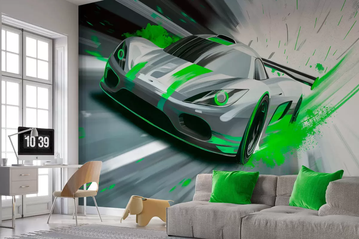 Fototapeta dynamiczny samochód sportowy w stylu rysunku cyfrowego z zielonymi akcentami Nr w05069v4