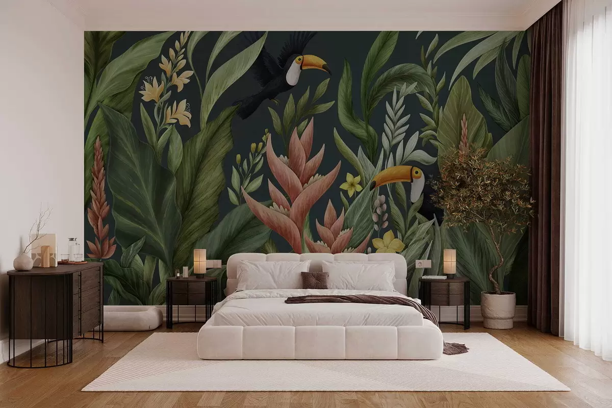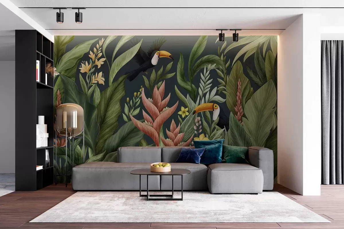Fototapeta Rośliny tropikalne i ptaki z dużymi dziobami na ciemnym tle Nr w05088v2