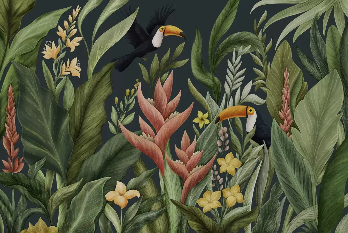 Fototapeta Rośliny tropikalne i ptaki z dużymi dziobami na ciemnym tle Nr w05088v2