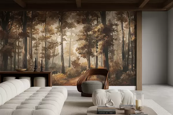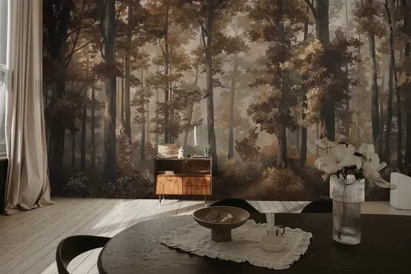 Fototapeta Jesienna scena leśna z ciepłym światłem i gęstymi drzewami Nr w05089v1