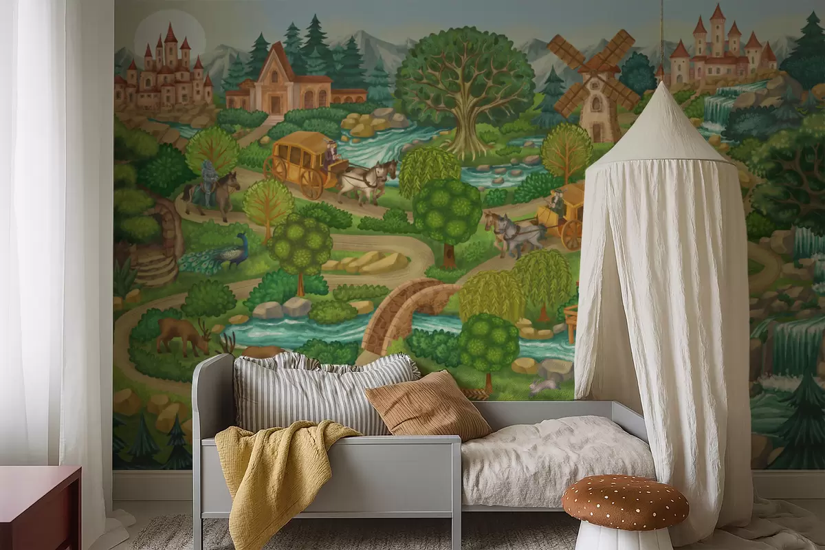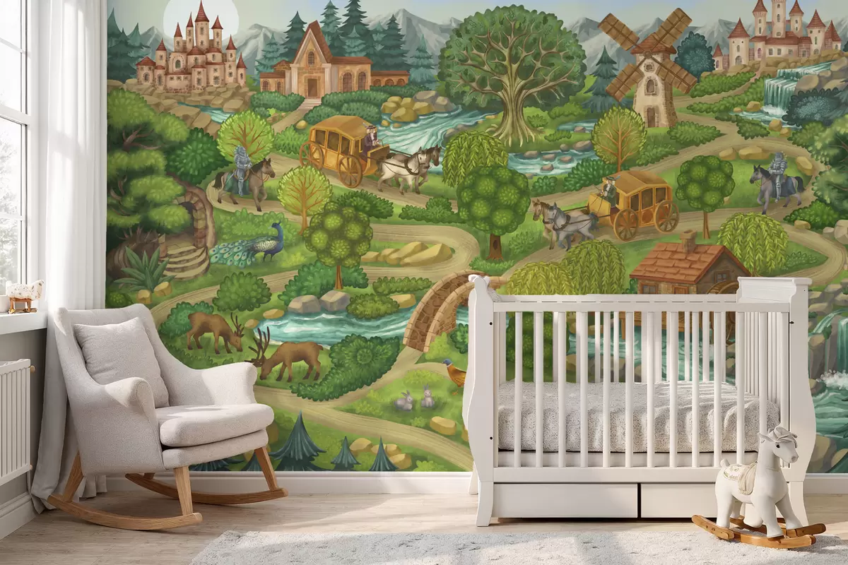Fototapeta Ilustracja przedstawiająca wróżki, zamki, lasy, rzeki i podróżników Nr w05091v1
