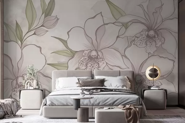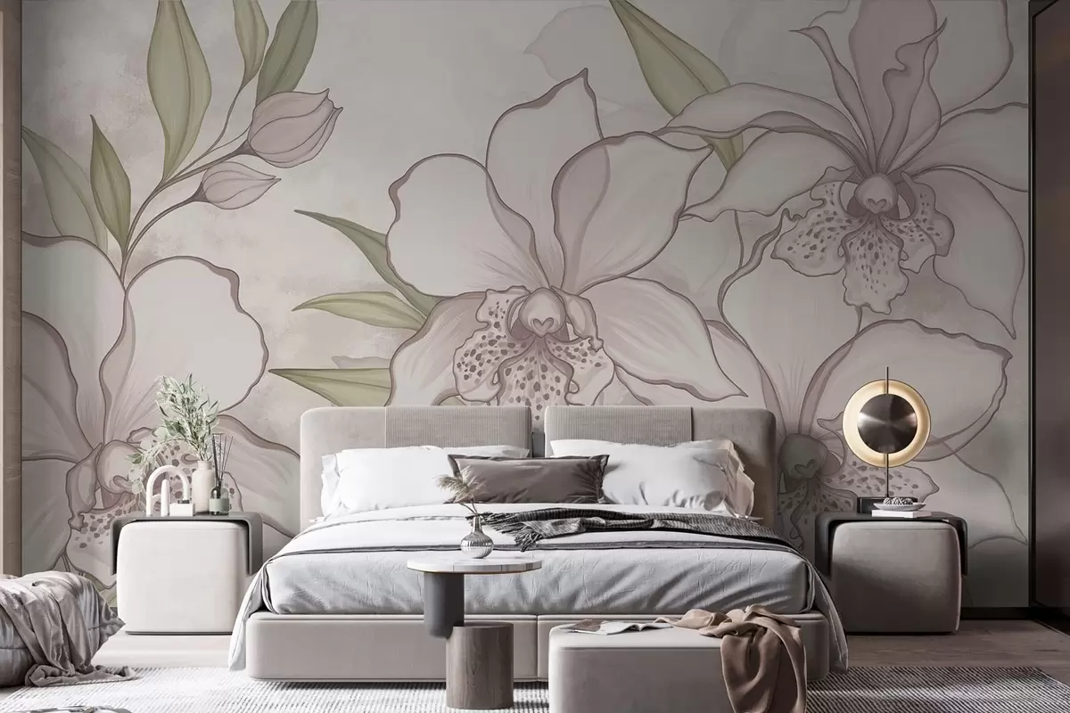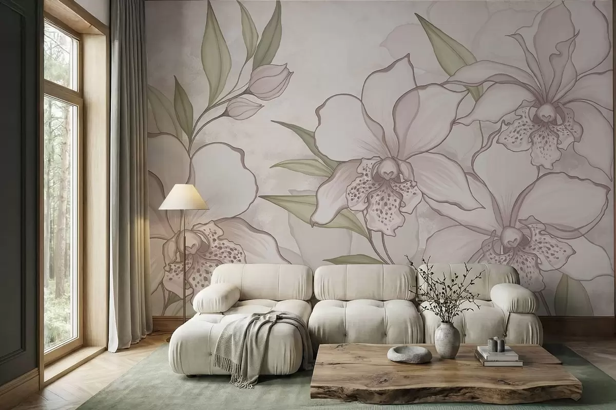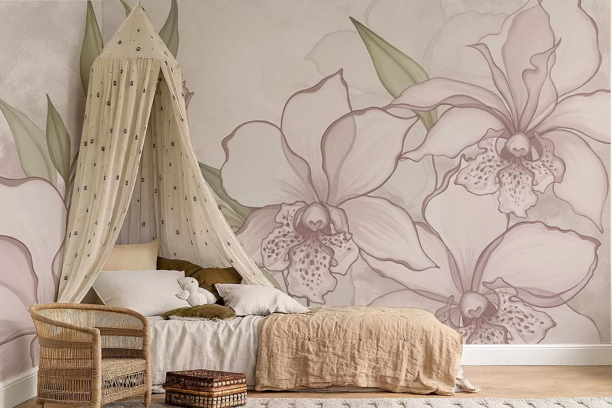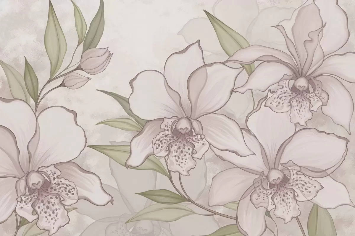 Fototapeta Ilustracja przedstawiająca jasne orchidee z liśćmi na beżowym tle Nr w05117