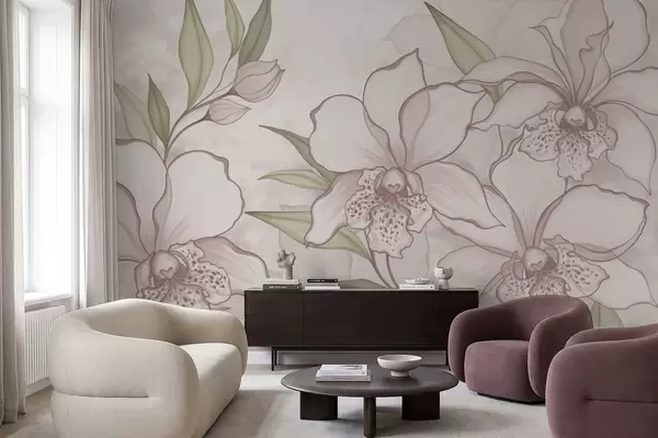 Fototapeta Ilustracja przedstawiająca jasne orchidee z liśćmi na beżowym tle Nr w05117