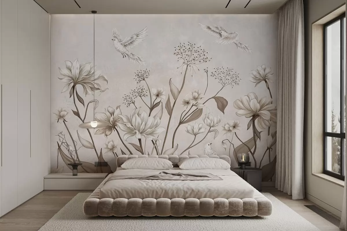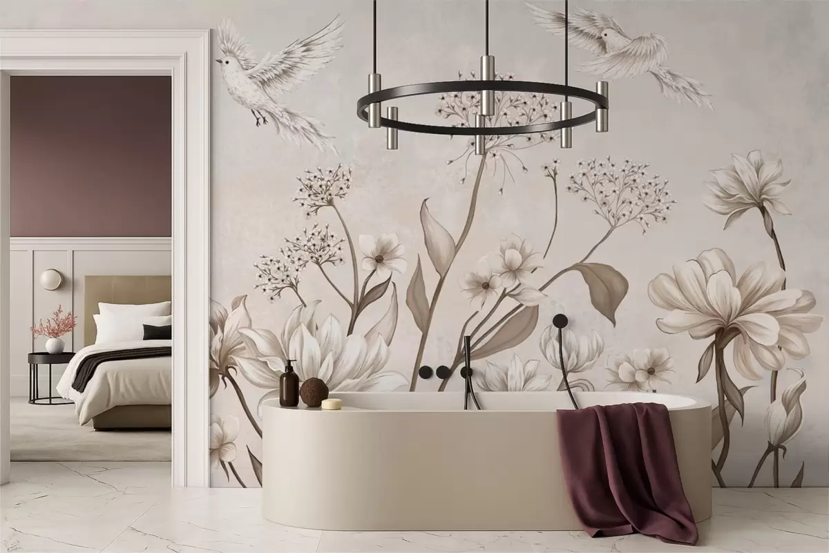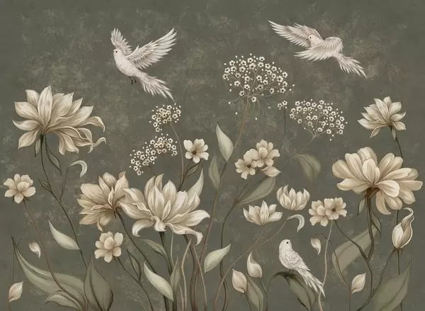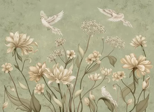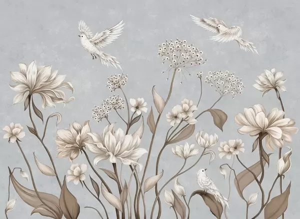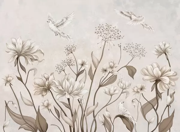 Fototapeta Delikatne kwiaty i ptaki na jasnym tle Nr w05118