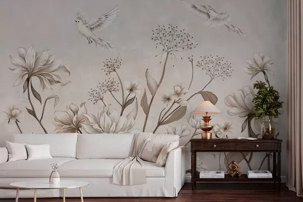 Fototapeta Delikatne kwiaty i ptaki na jasnym tle Nr w05118