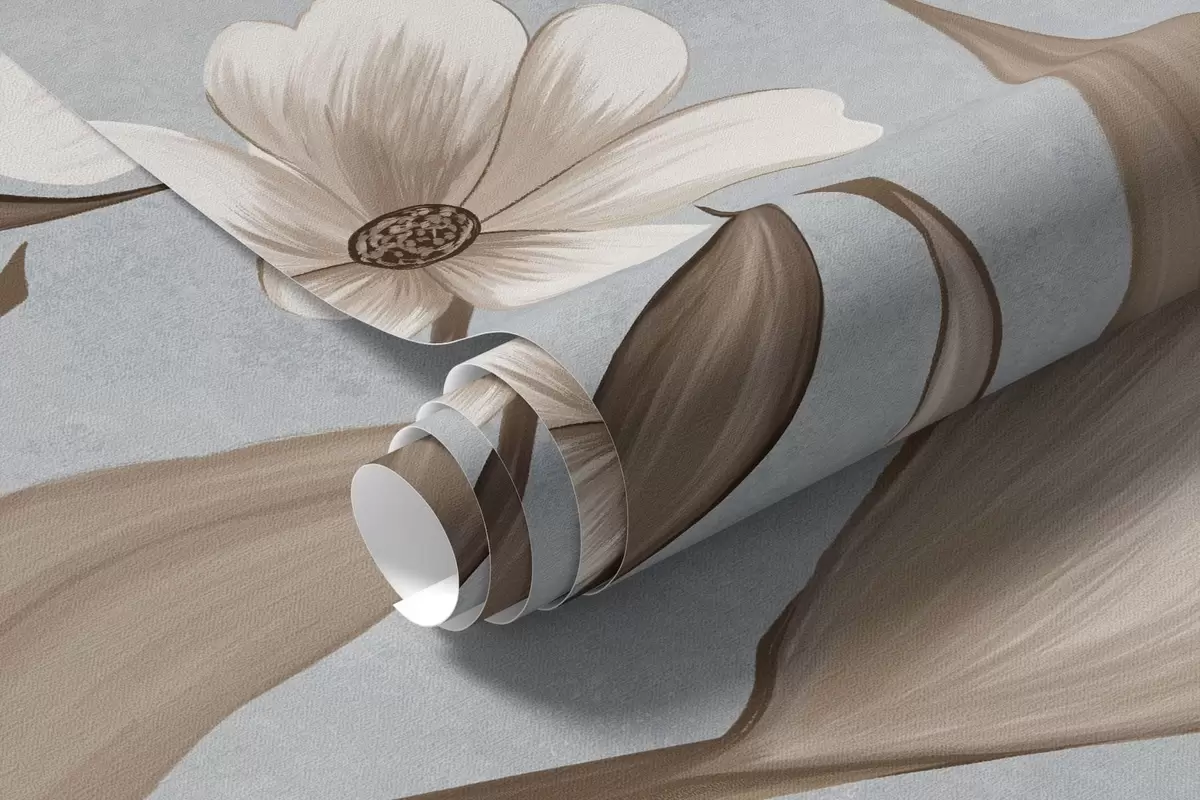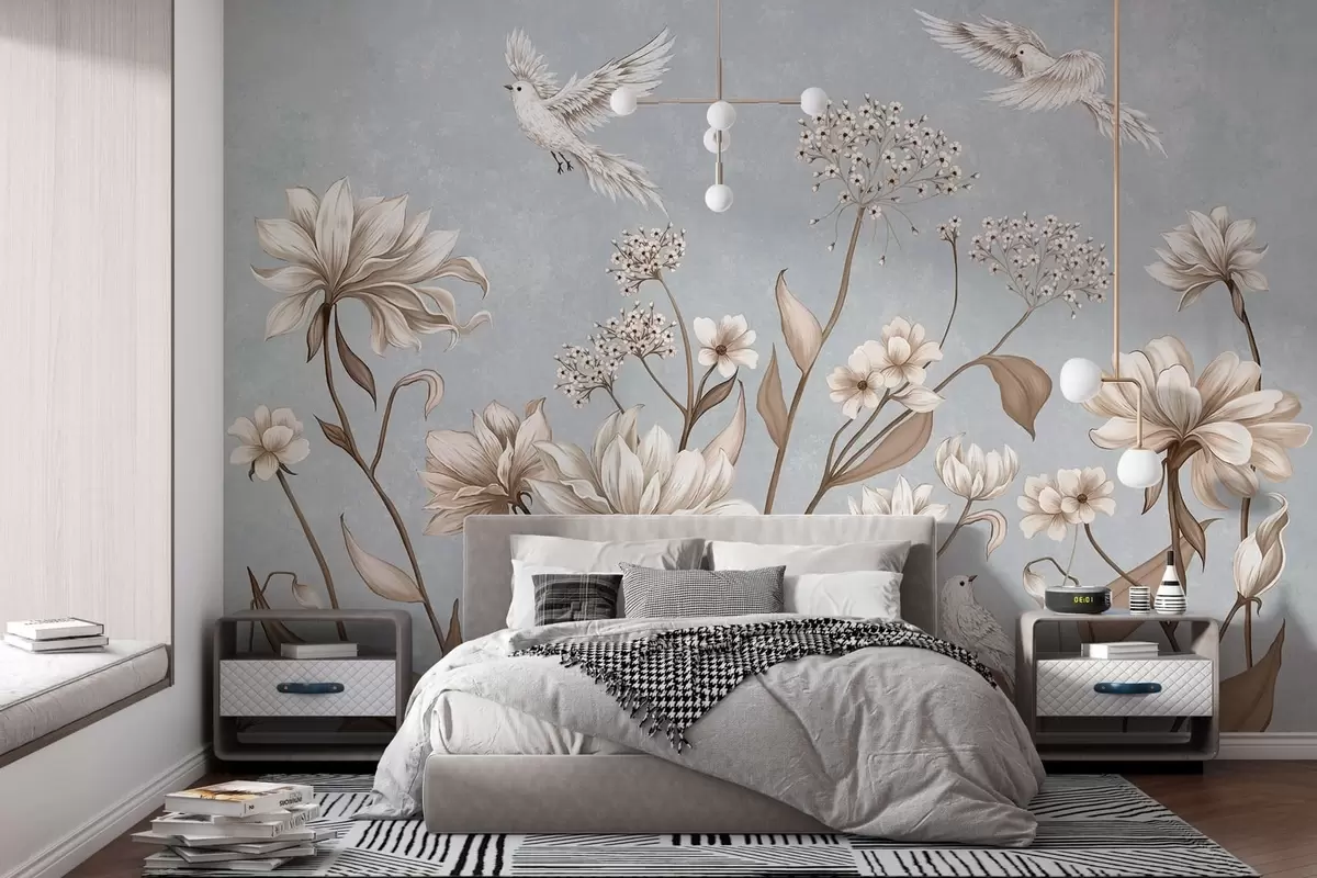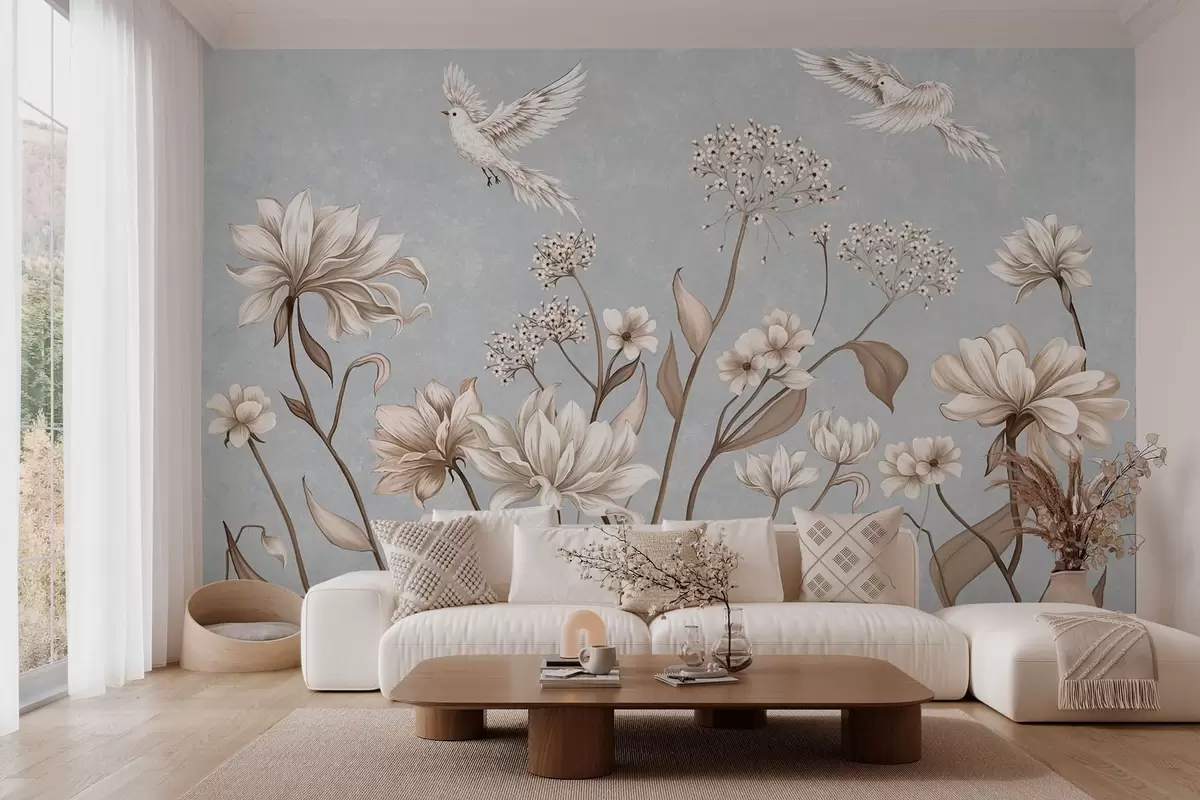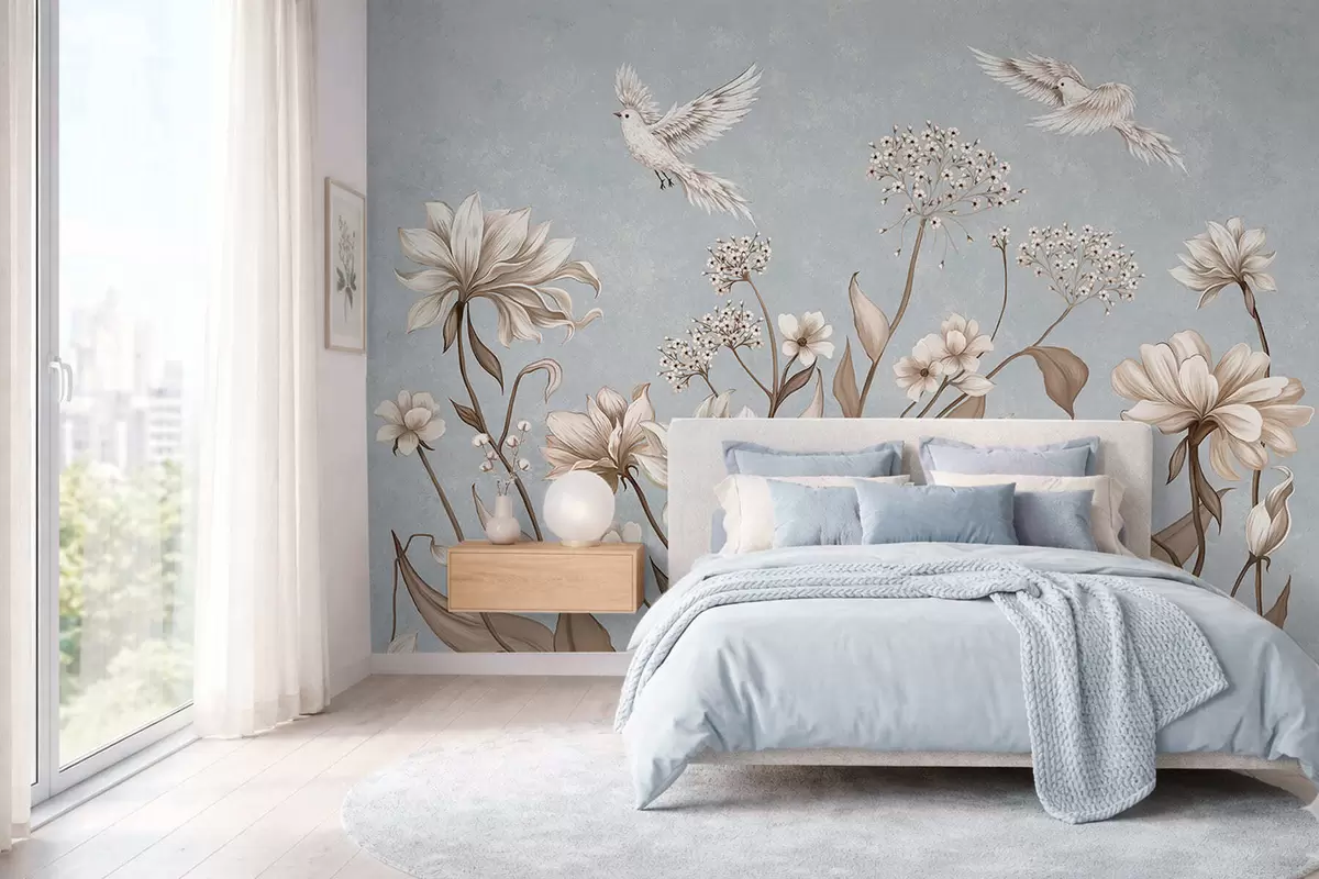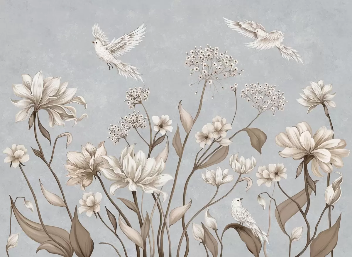 Fototapeta Kwiaty i ptaki na chłodnym, szaro-niebieskim tle Nr w05118v2
