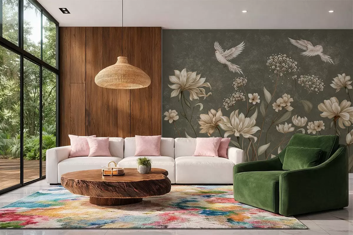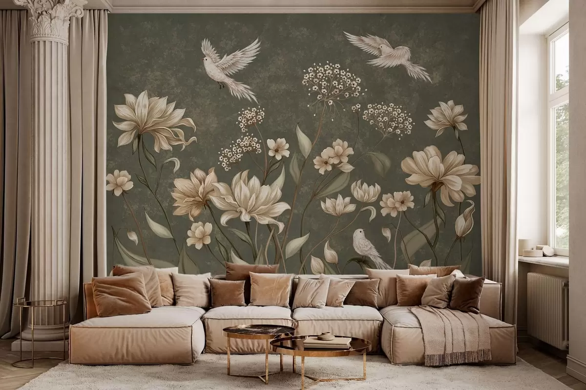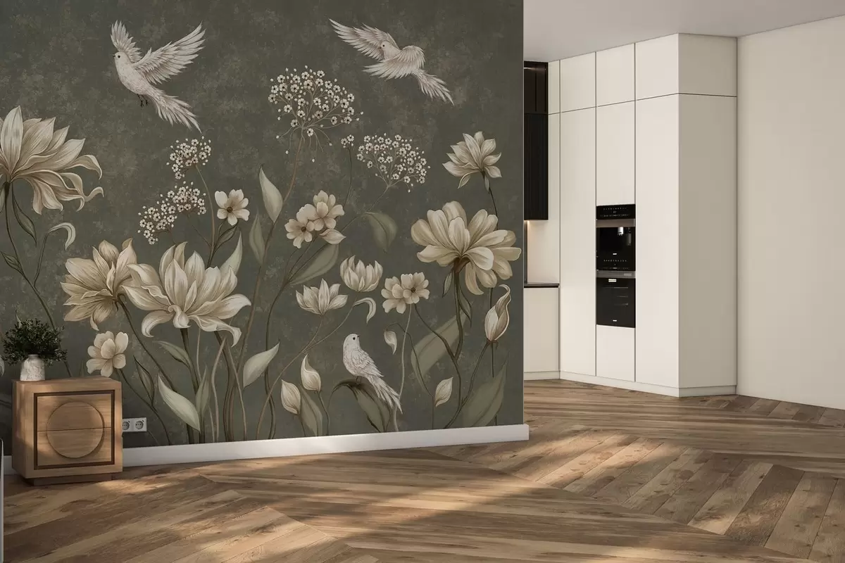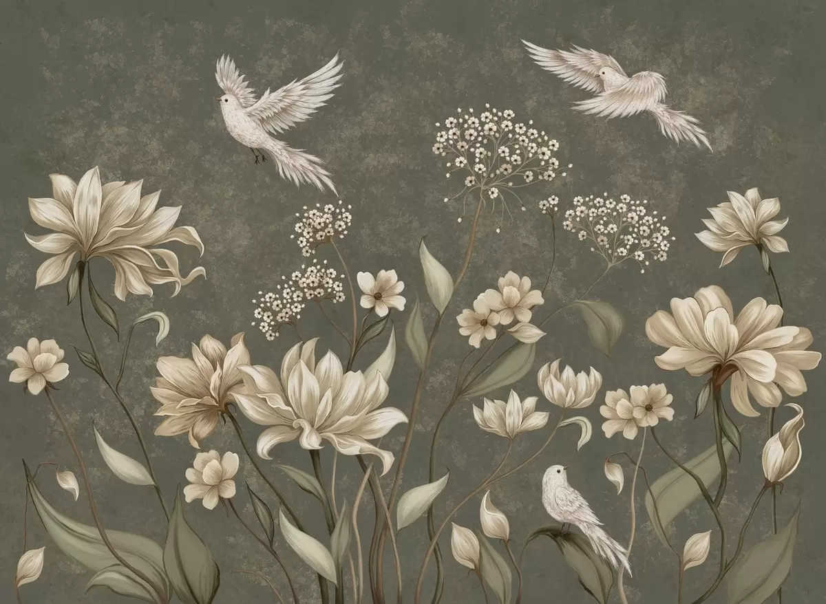 Fototapeta Kwiaty i ptaki na ciemnozielonym tle Nr w05118v3