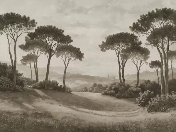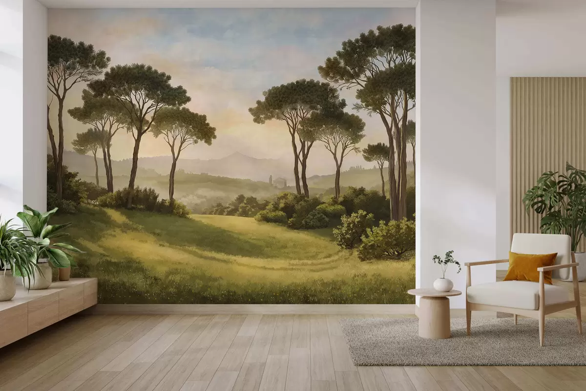 Fototapeta Krajobraz z drzewami w ciepłym świetle zachodzącego słońca Nr w05122