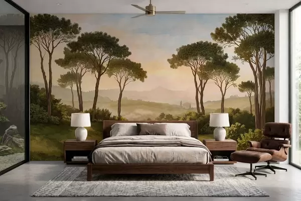 Fototapeta Krajobraz z drzewami w ciepłym świetle zachodzącego słońca Nr w05122