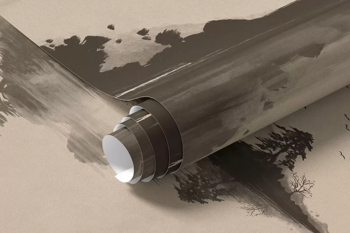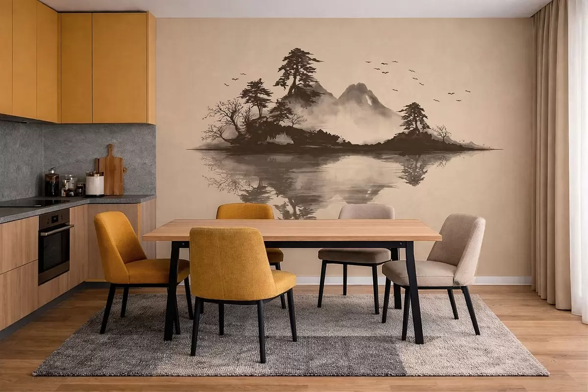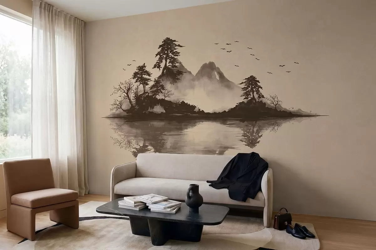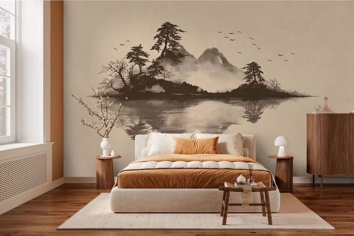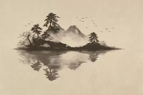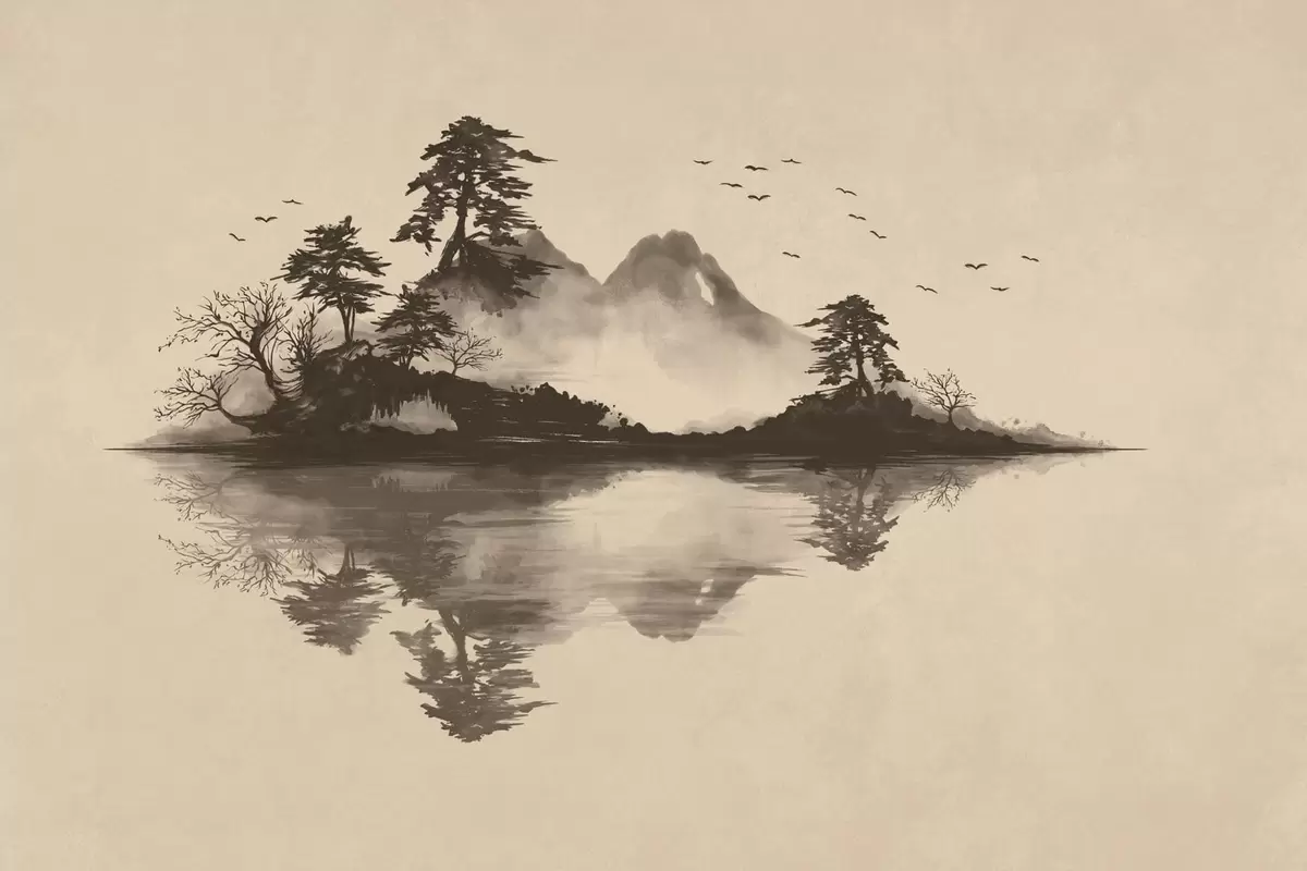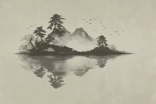 Fototapeta Pejzaż górski w technice sumi-e z sosnami i odbiciem Nr w05124