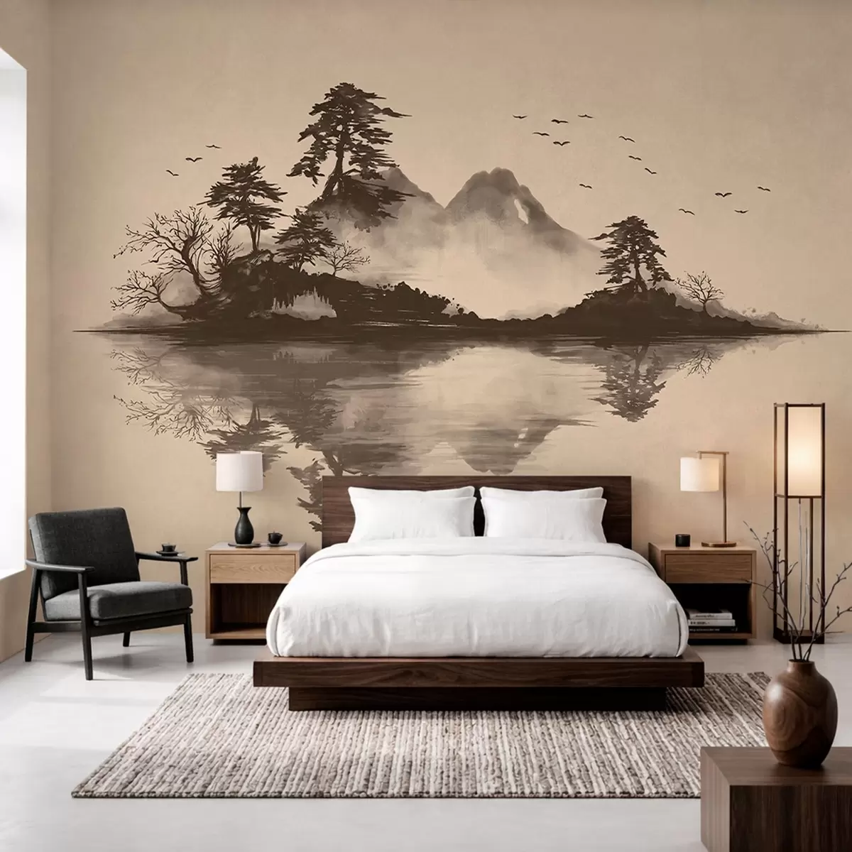 Fototapeta Pejzaż górski w technice sumi-e z sosnami i odbiciem Nr w05124