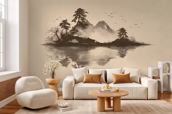 Fototapeta Pejzaż górski w technice sumi-e z sosnami i odbiciem Nr w05124