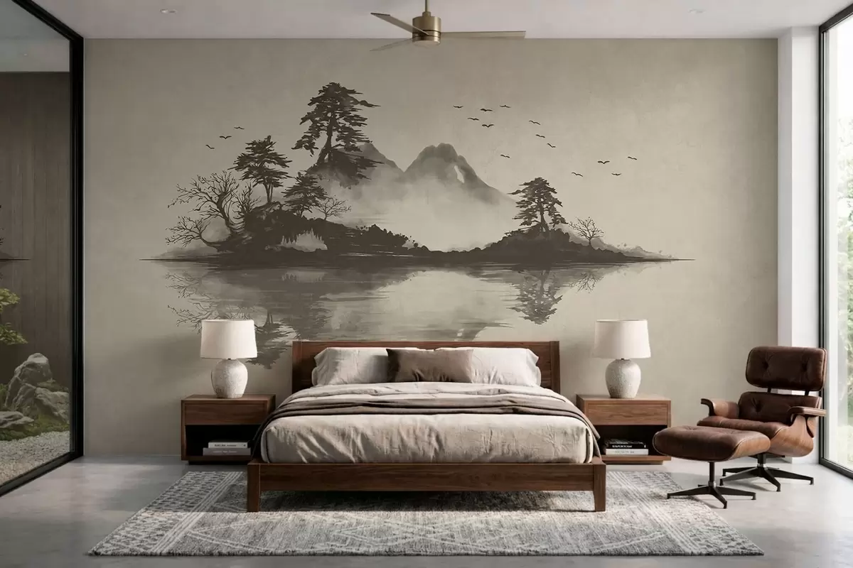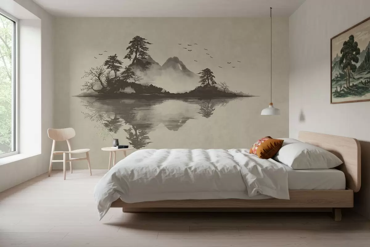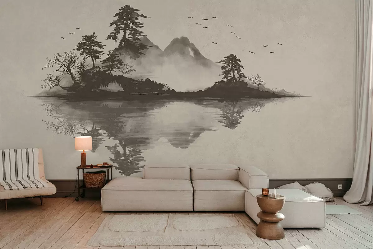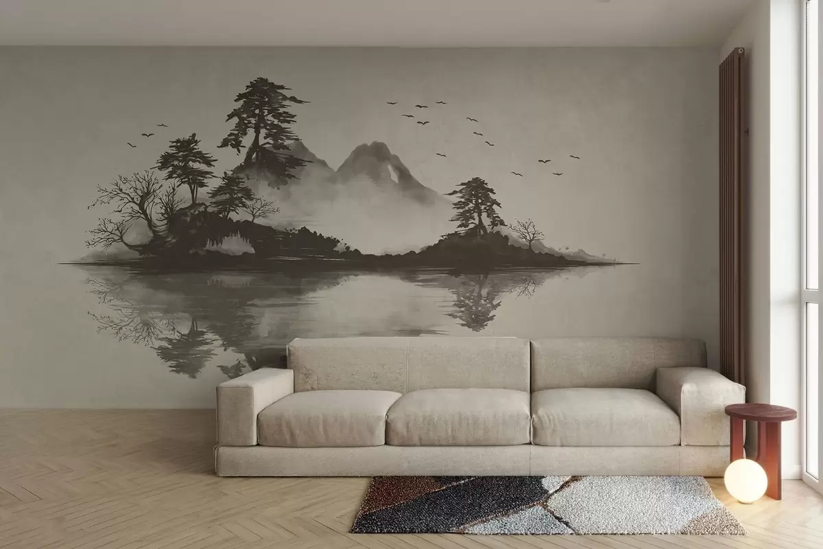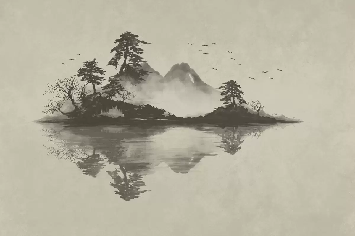 Fototapeta Pejzaż górski w technice sumi-e utrzymany w delikatnych odcieniach szarości Nr w05124v1