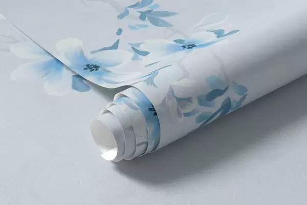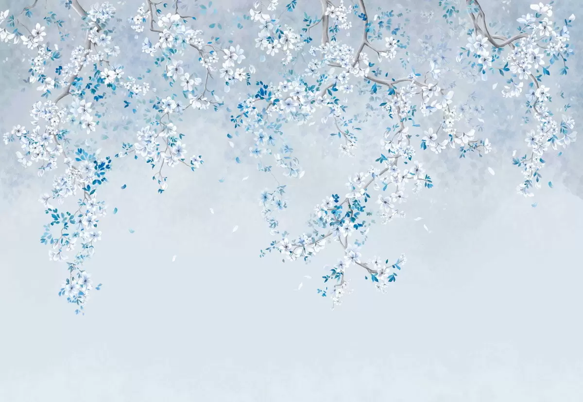 Fototapeta Gałęzie z białymi i niebieskimi kwiatami na chłodnym tle Nr w05129v2