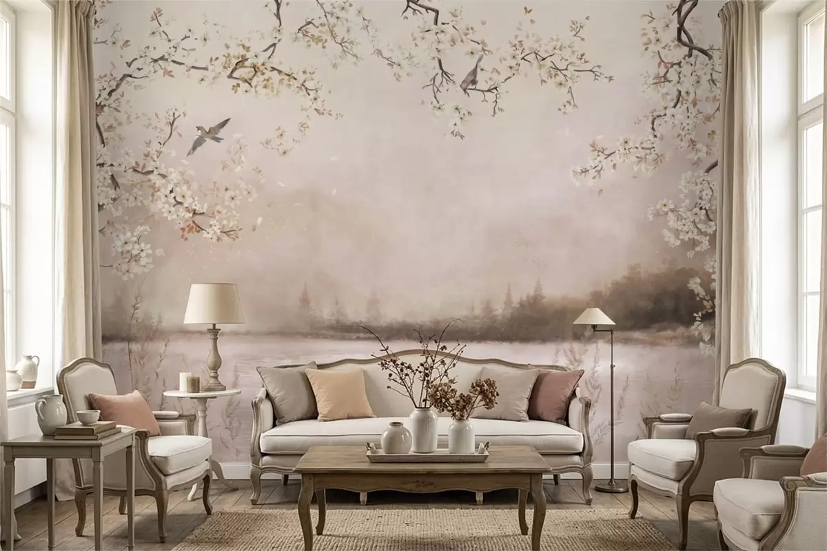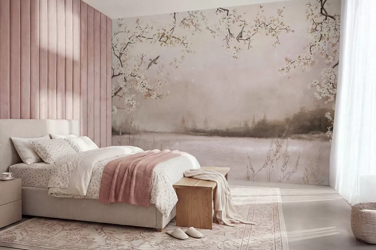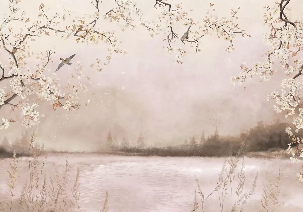 Fototapeta Kwitnące gałęzie nad spokojnym jeziorem z ptakami we mgle Nr w05155v1