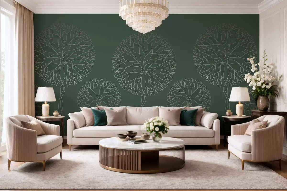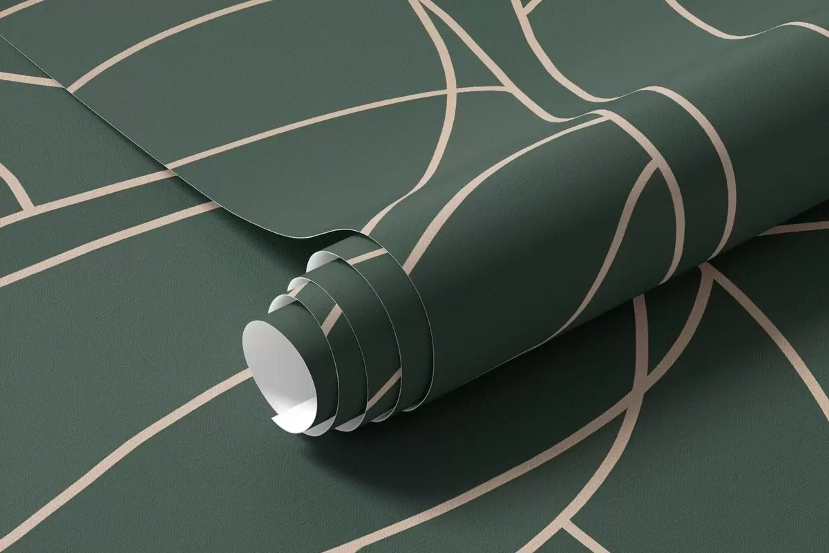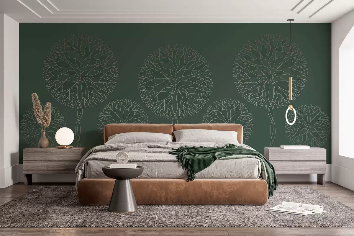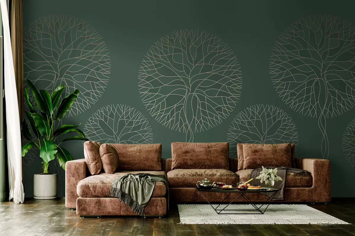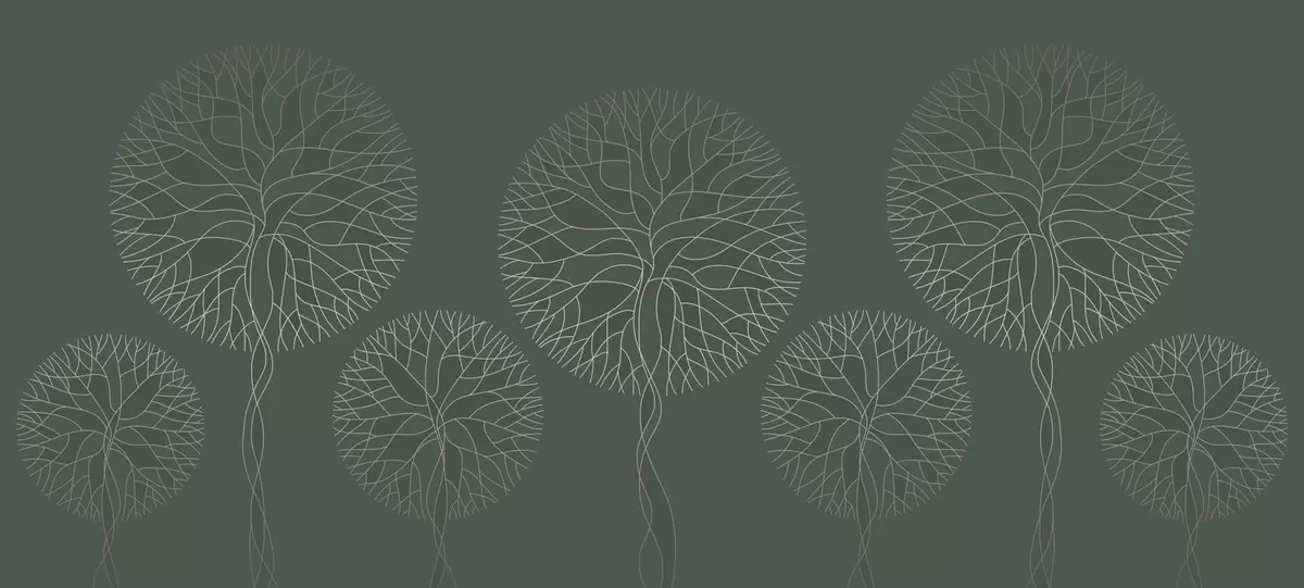 Fototapeta Fantazyjne drzewa o liniowych kształtach i bujnych koronach w eleganckich ciemnozielonych odcieniach Nr w05213v2