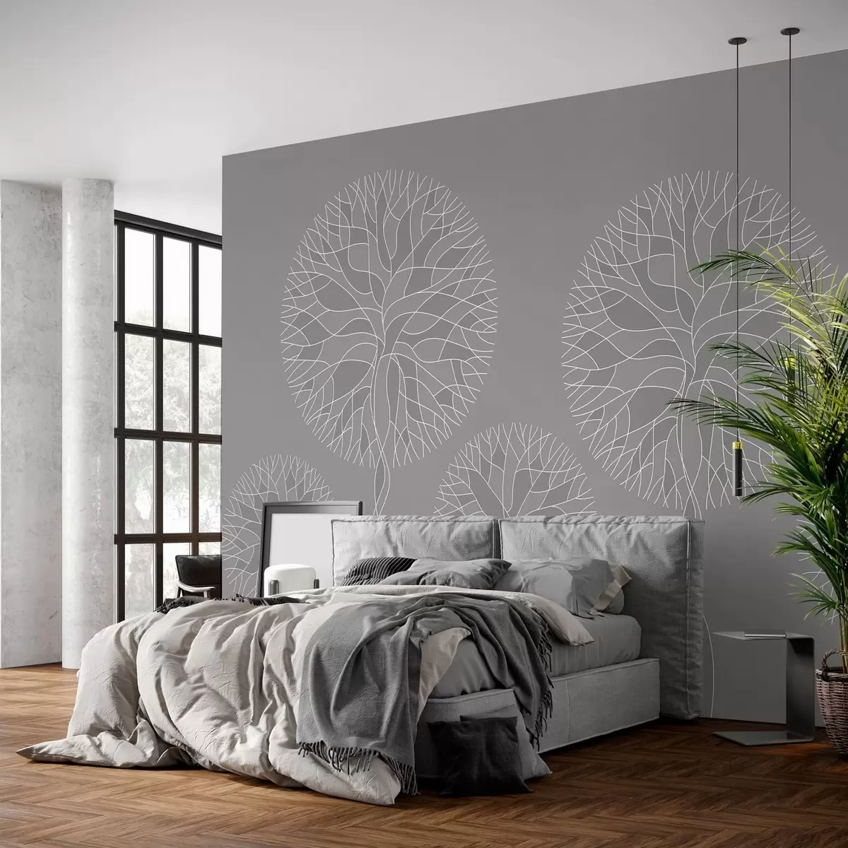 Fototapeta Fantazyjne drzewa o liniowych kształtach i bujnych koronach w odcieniach średniej szarości Nr w05213v5
