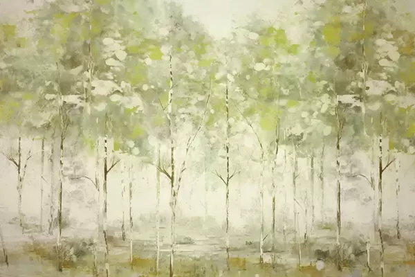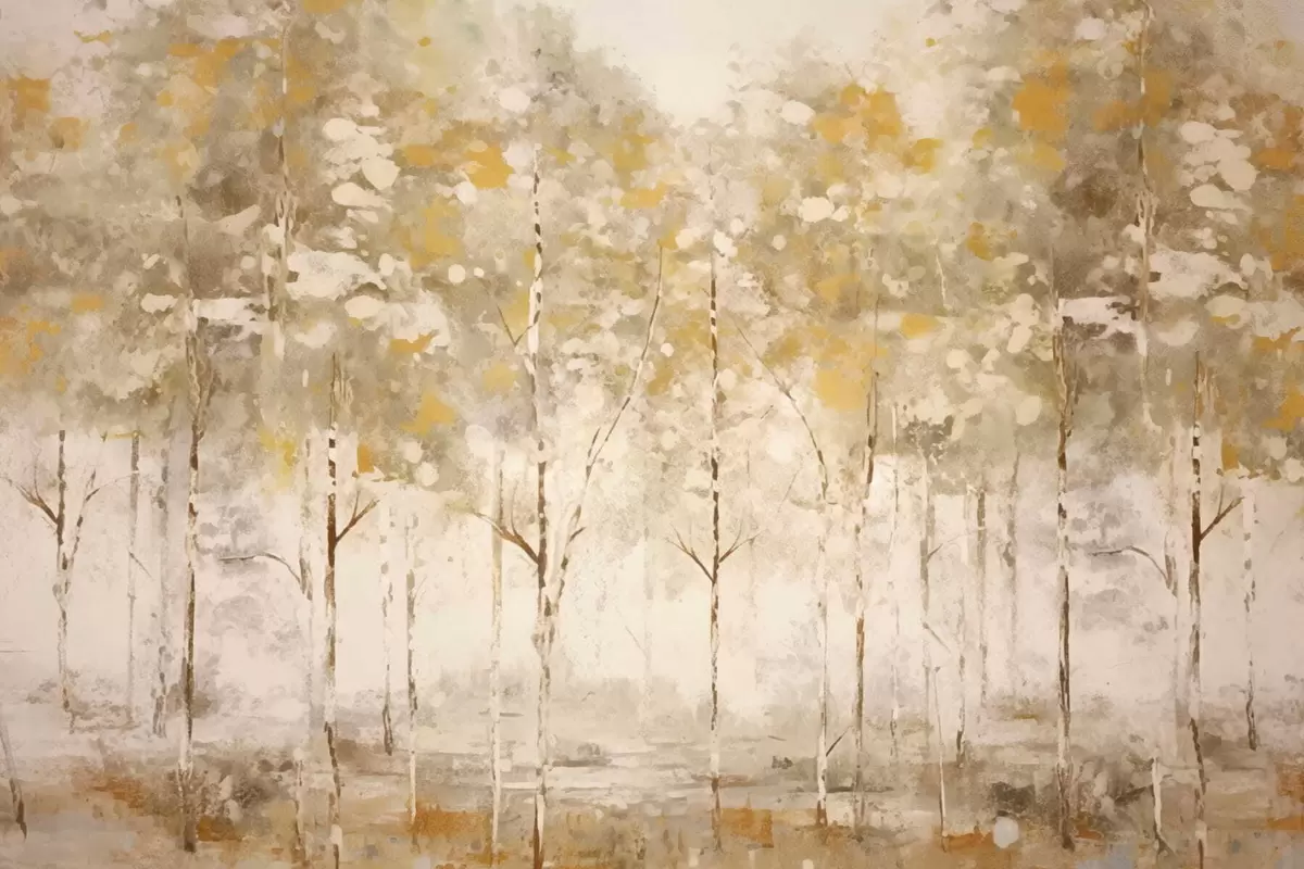 Fototapeta Stylizowany las z smukłymi drzewami w ciepłych barwach Nr w05221