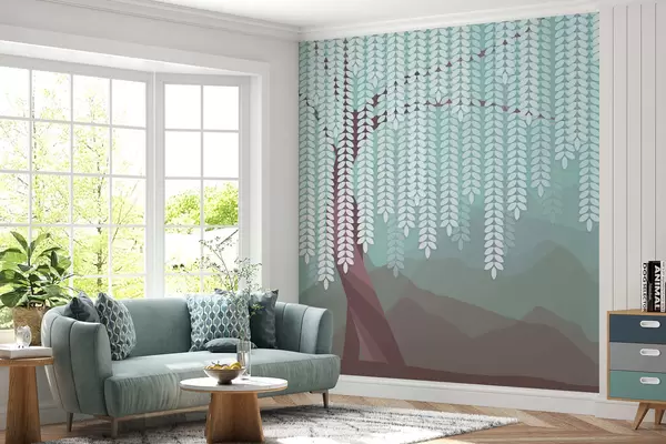 Fototapeta Stylizowana wierzba z wiszącymi liśćmi na tle minimalistycznych gór w odcieniach czekolady i turkusu. Nr w05232v1